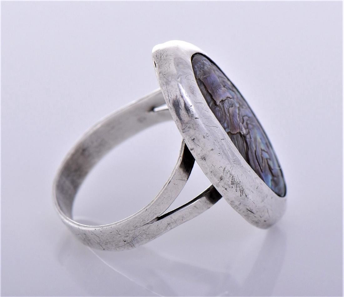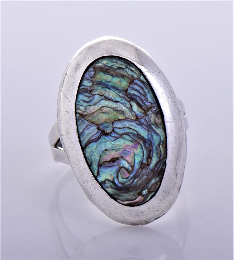 Vintage 1960s Taxco Abalone Shell and Sterling Silver Mexican Ring. Ring Size 7. Estimated less than 50 yrs old. 925 Sterling Silver consisting of 92.5% silver and 7.5% copper. Tested Positive using Nitric Acid Chemical Scratch Test, Cloth Rub Test, Smell Test, and Magnet Test. Markings of 925 or Sterling stamp. The reason silver needs to be combined with other metals is that it is very difficult to make great designs with just pure silver, which is very soft and malleable. A bit of hardness has to be introduced by adding other metals such as copper. That is why jewelers are capable of making the most intricate an complex designs with 925 Sterling Silver. Silver is one of the most valuable elements next to gold. Mexico is the leading producer of silver, followed by the United States, Canada, Australia, Spain, Peru, and Russia. Many countries do not require their precious metal items to be stamped and therefore we test to ensure we accurately represent the product. Size and/or Weight: See Measurement Photo. (Photos Represent The Lot Condition. Read T&C's)