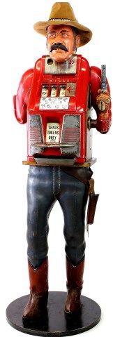 machine, based on Mills High Top slot machine, arm replaced with cast aluminum 6 gun shooter. Good working condition, stands 75" tall, includes full box of aluminum tokens marked Keystone SD, includes original key to back door. Est. 5500-10,000