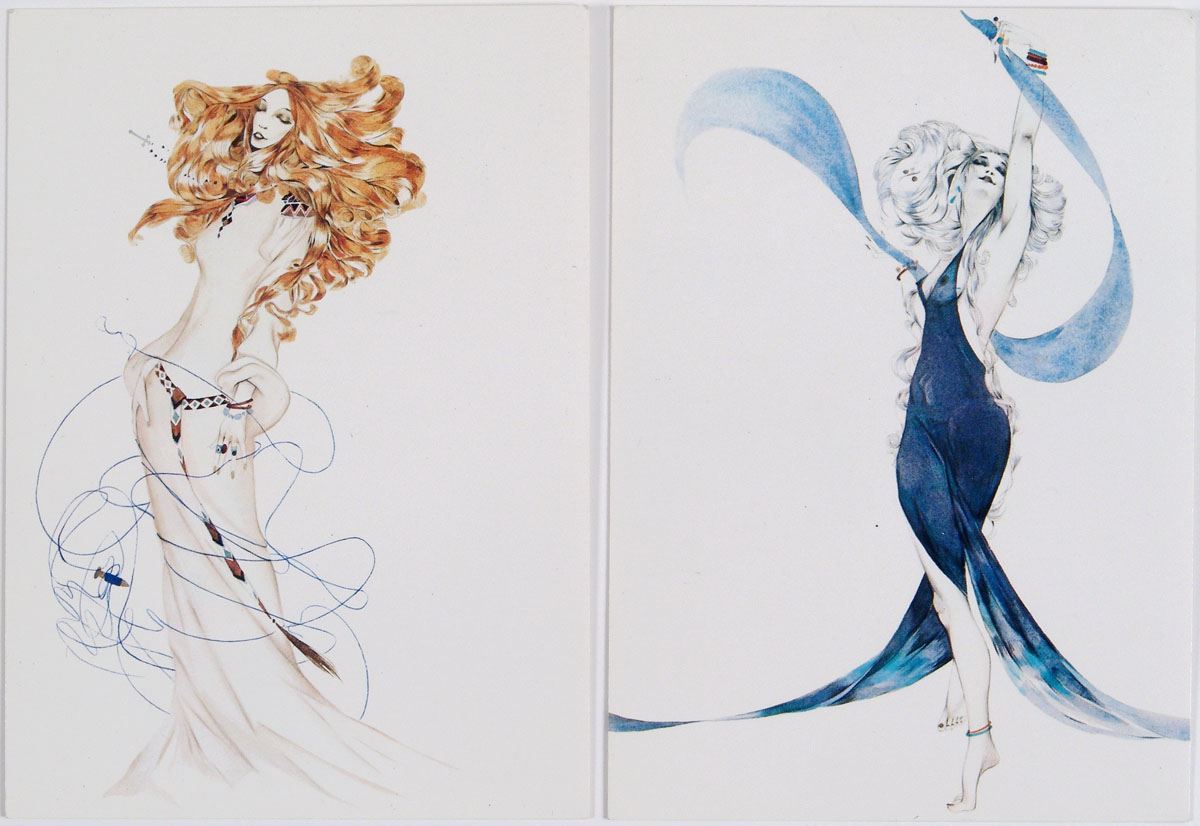 This is a pair of really cool vintage (probably 1970s) greeting cards featuring artwork by Martin Caulkin titled "Lady of Shalott" and "Salome." Printed in England. SIZE: Approx. 5" x 7" each. Martin Caulkin was born in Birmingham in 1945. He studied Graphics and illustration in the West Midlands at Birmingham College of Arts and Crafts. Then in the mid- sixties, Caulkin moved to London as a freelance illustrator and art teacher of drawing and painting. In the late seventies Martin Caulkin contemporary paintings started to be published in print form and distributed successfully worldwide. This allowed him to move from London to rural Worcestershire- a move which prompted a shift away from figurative painting to an intensely personal artistic treatment of landscape. Many of Martin Caulkin paintings feature Herefordshire, Worcestershire and Warwickshire scenes. **MORE cards from 1950s to 1990s (risque, nude, art sci-fi, oddities) in this and future auctions. From the estate of a big collector who traveled the world and had some very scare paper items. Many postcards from small independent underground printers in Germany, Holland, France, UK, etc.