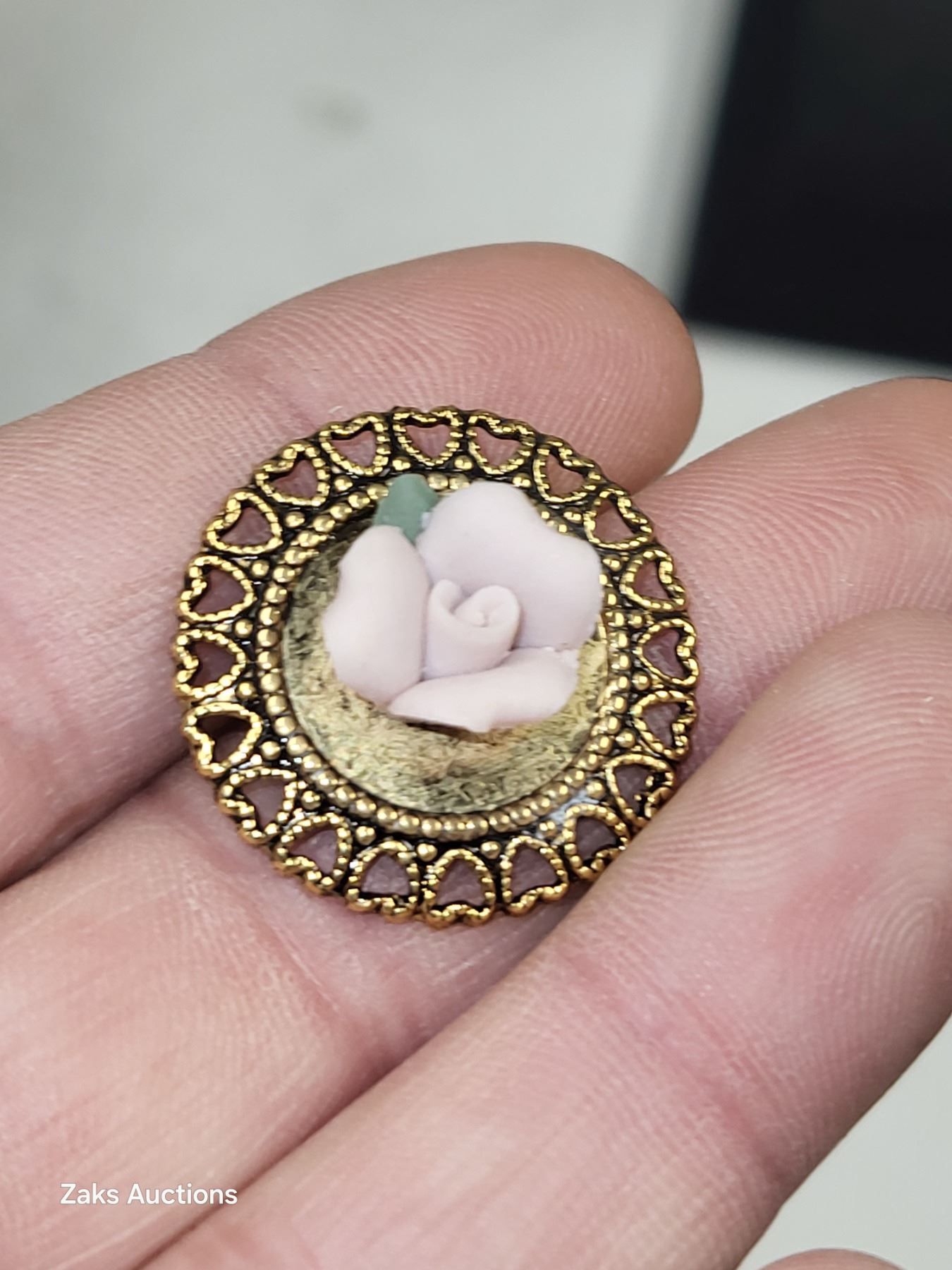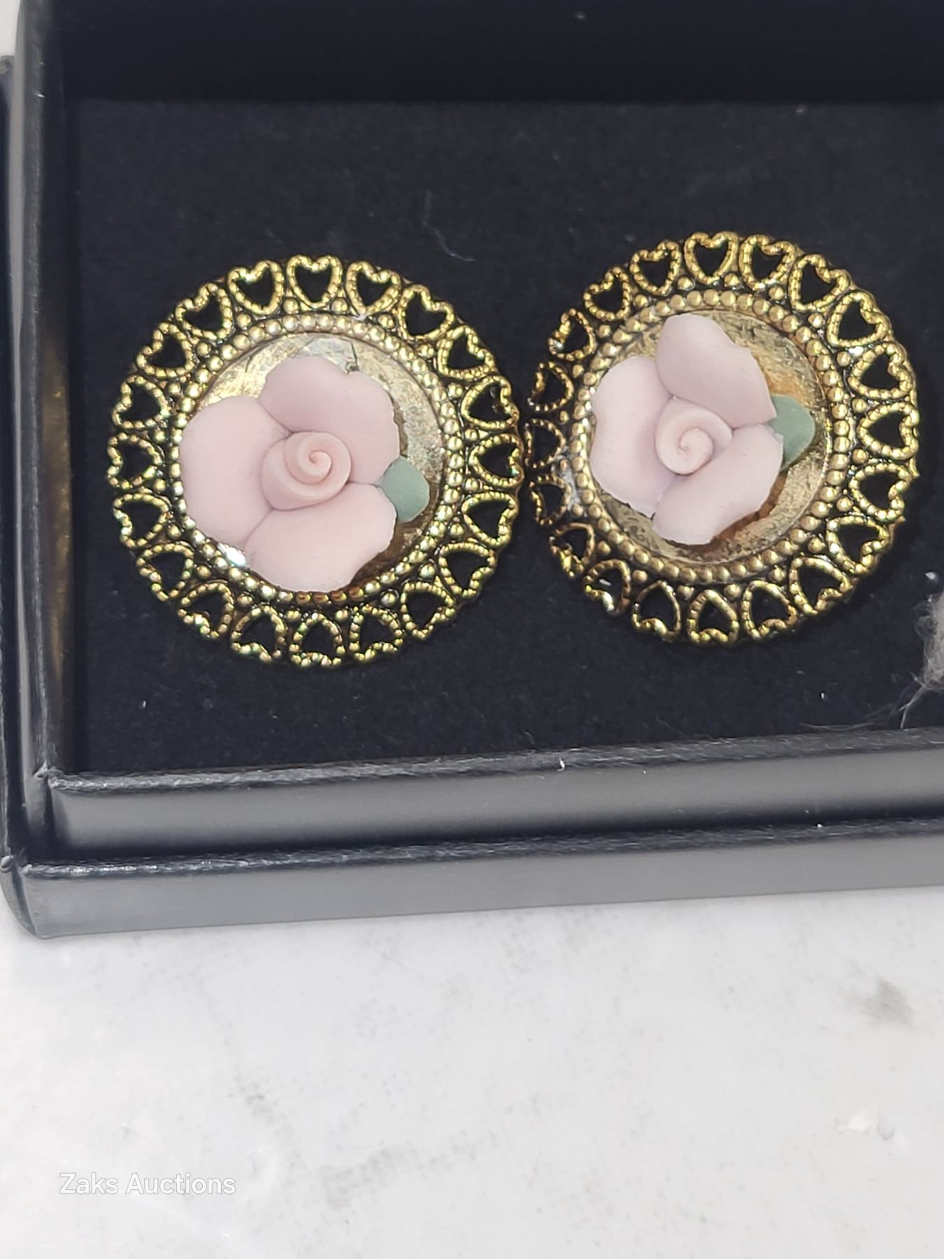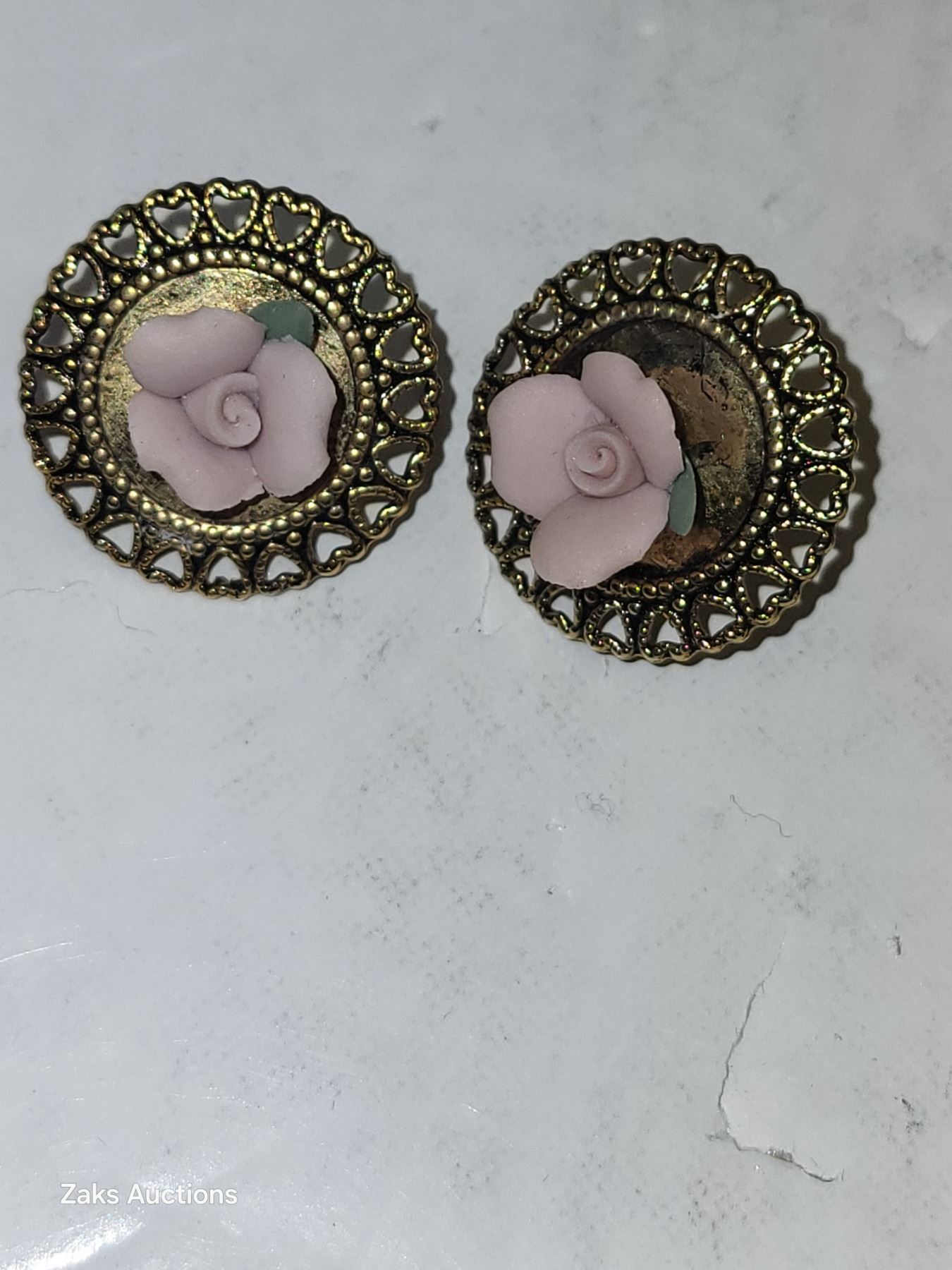 Vintage 1970s Delicate Powder Pink Ceramic Roses Gold Plated Clip On Earrings
