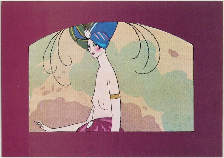 This is a vintage 1975 greeting card featuring an illustration of an Art Deco Persian princess. "Phili" Series by Splash Products, England. SIZE: Approx. 6" x 4".