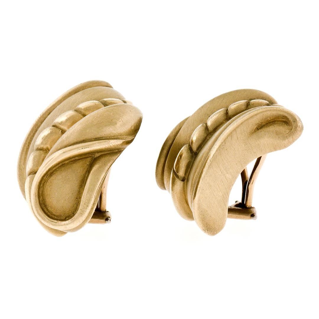 A vintage solid 18k gold pair of wavy clip on earrings by Kieselstein Cord.The earrings measure approximately 23.30x21.20mm and weigh a total of 28.52grams.