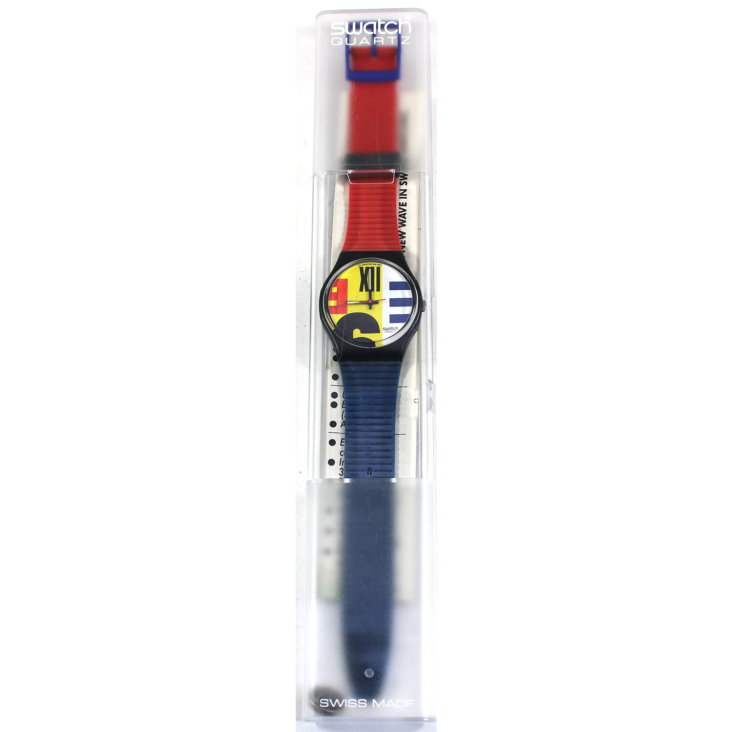 Vintage 1987 Swatch Gent GB117 NEW 'Nine to Six' Style Wristwatch in Original Case with Papers. Appears to be new and unworn. *Note if you want to wear the watch it's best to get a replacement band, as the original plastic one will most likely crack. Plastic case is scuffed. Needs battery.