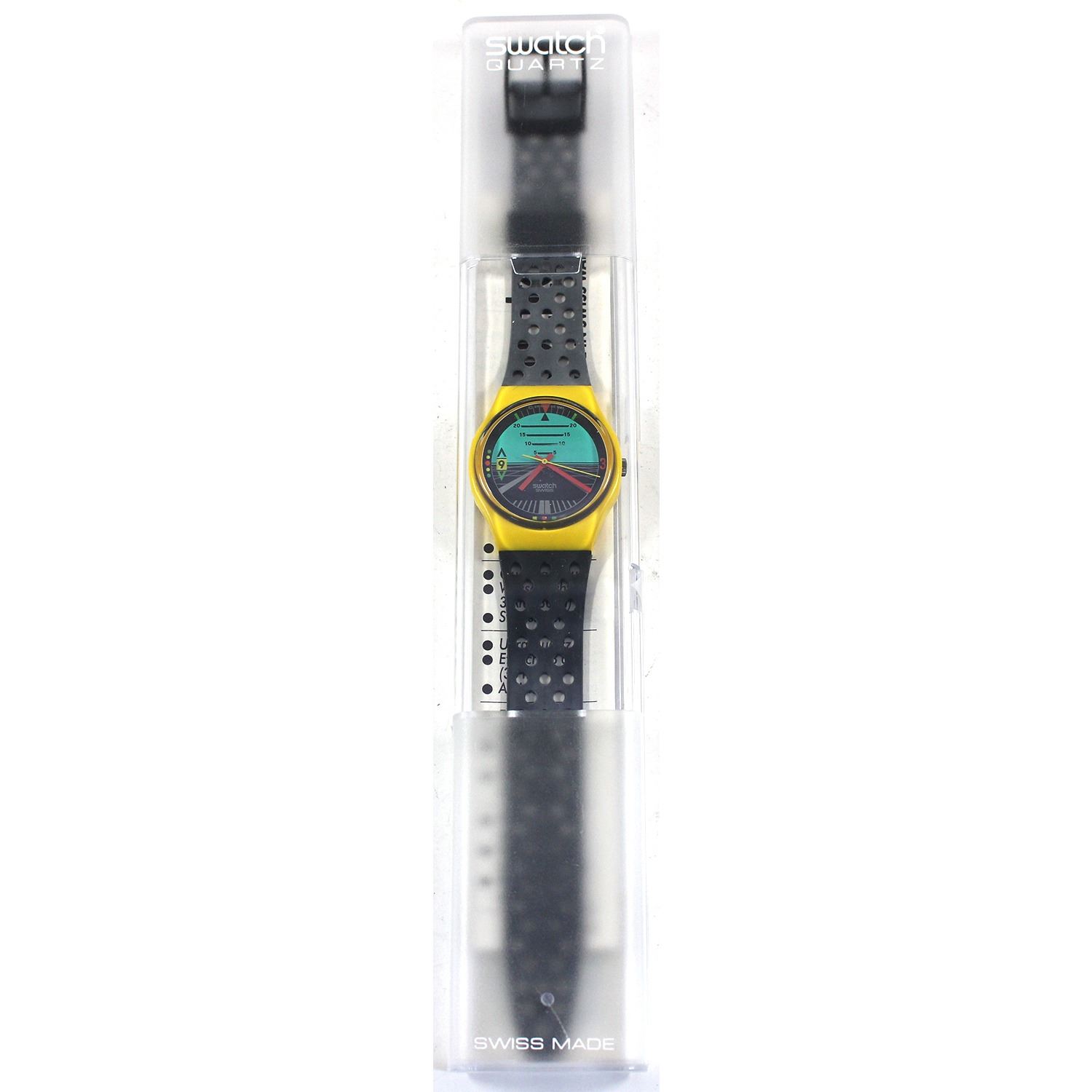 Vintage 1987 Swatch Gent GJ101 NEW 'Follow Me' Style Wristwatch in Original Case with Papers. Appears to be new and unworn. *Note if you want to wear the watch it's best to get a replacement band, as the original plastic one will most likely crack. Plastic case is scuffed. Needs battery.