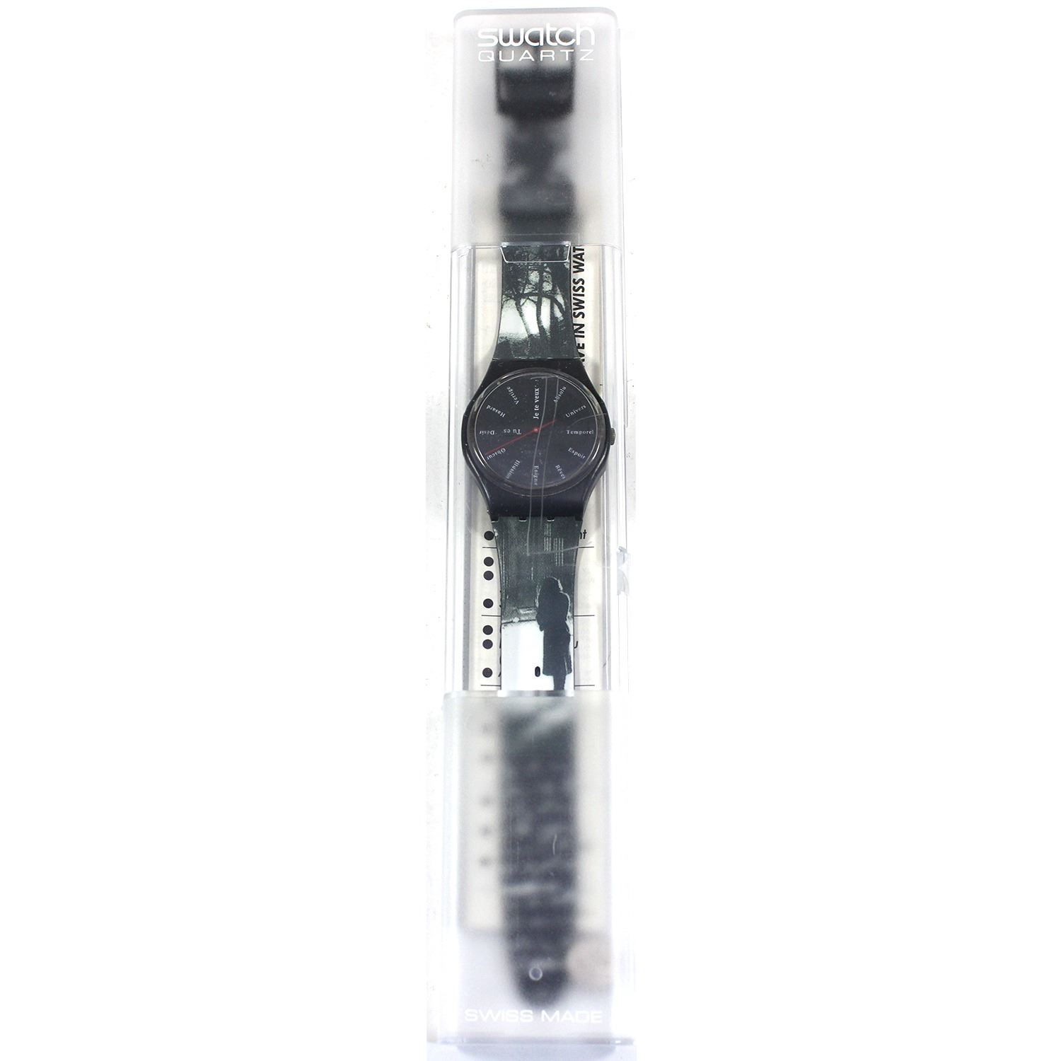Vintage 1989 Swatch Gent GB123 USED 'St. Germain' Style Wristwatch in Original Case with Papers. Shows signs of wear on the head and light scratches on the face, band looks good. *Note if you want to wear the watch it's best to get a replacement band, as the original plastic one will most likely crack. Plastic case is scuffed. Needs battery.