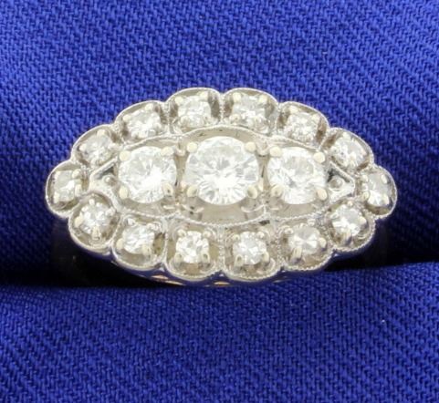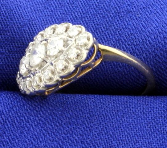 The ring is 14K yellow and white gold and contains one .28, two .15 and fourteen .03ct high quality diamonds, all SI clarity/G color. Size 7 5.0g