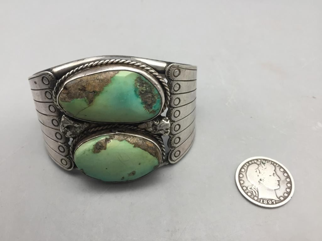 Description: For sale in this lot is a vintage cuff bracelet, set with two green turquoise stones and simple silver designs. Maker: Unmarked. Approx. Age: Circa 1960s-1970s. Size: Inside circumference measures 6-1/2 inches long. Opening is an additional 1-1/8 inches, fitting of a 7-5/8 inch wrist. Width is 2-1/8 inches. Weighs 94.3 grams. Condition: Good for its age, normal wear expected. Please look closely at the pictures - they are an important part of our description. Shipping: There will be a $5 handling / packaging fee for shipping this lot. The actual cost of postage will be added on top of that.