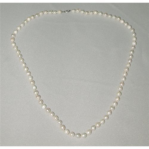 This cultured pearl single-strand necklace with cream rose colored pearls measures 24" and contains 76 pearls ranging in size from 6.0 mm to 6.5 mm. 14K white gold fish-hook clasp. Pearls are near round, uniform, moderately blemished, with thin nacre, fair luster, and fair matching, per written appraisal by a GIA Graduate Gemologist (GG) and Accredited Jewelry Professional (AJP) at Manhattan Appraisers of 43 West 47th Street in New York. We believe this necklace dates is roughly 30 years old or more. Replacement value appraised at $890.