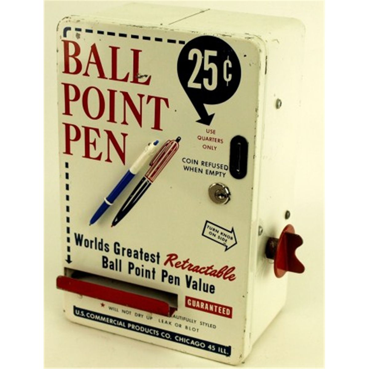 Vintage 25 cent ball point pen vendor in fine original condition with original keys, 13" tall.