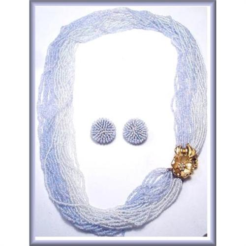 Talk about making an entrance into a room! Spectacular vintage 1950's all glass necklace featuring 26 multi strands of soft blue glass beads with a sparkle in them to make it stand out. A gilt floral dimensional clasp that can be worn on the side or in the back adds drama. The strands are gathered with two gold gilt filigree ends and attach to this ornately designed clasp. The matching clip on earrings are delicate looking with some amazing beadwork. The necklace is 26? long and thick and so well made it hangs like rich silk on your neck. In great shape these are really prettier than the photos.