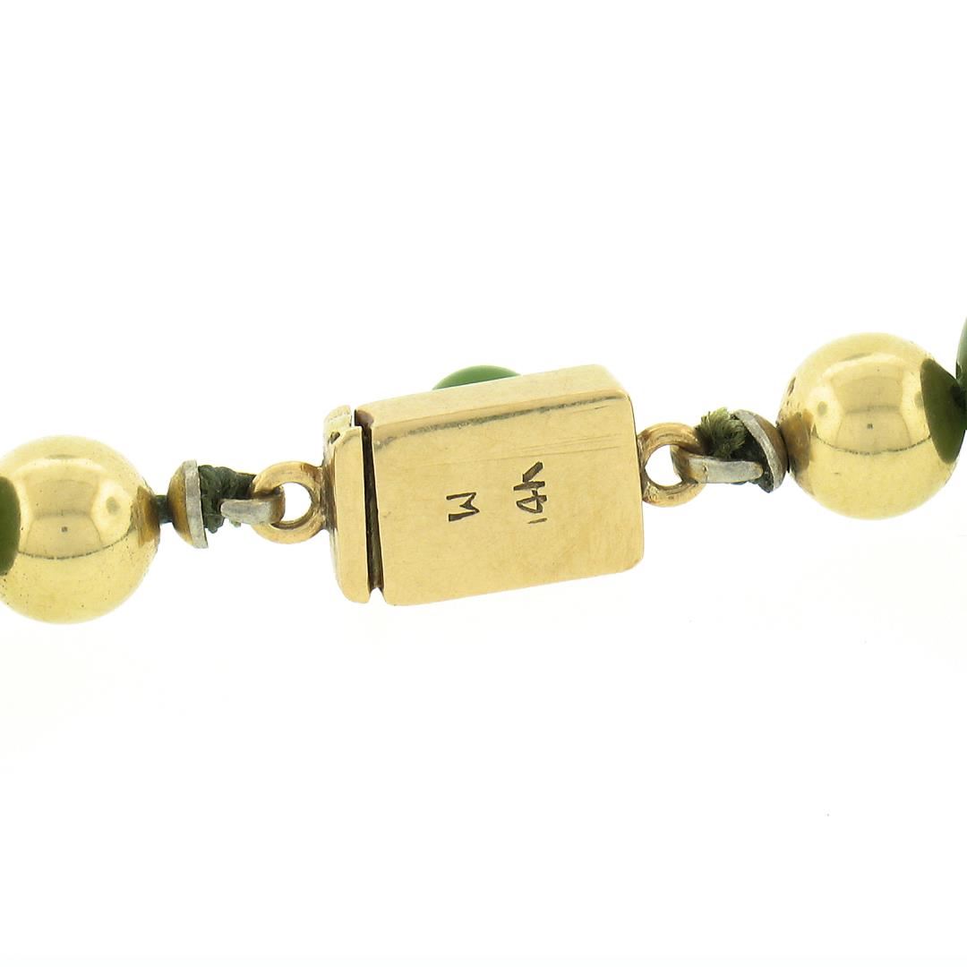 A vintage solid 14k yellow gold bead strand necklace, with 56 GIA graded round bead shape natural nephrite jade ((55) 9.77-10.3+mm each & (1) 5.1mm). It weighs a total of 95.50 grams, measures 10.3mm wide, and measures 29 inches in length. Comes with all original relevant certifications.