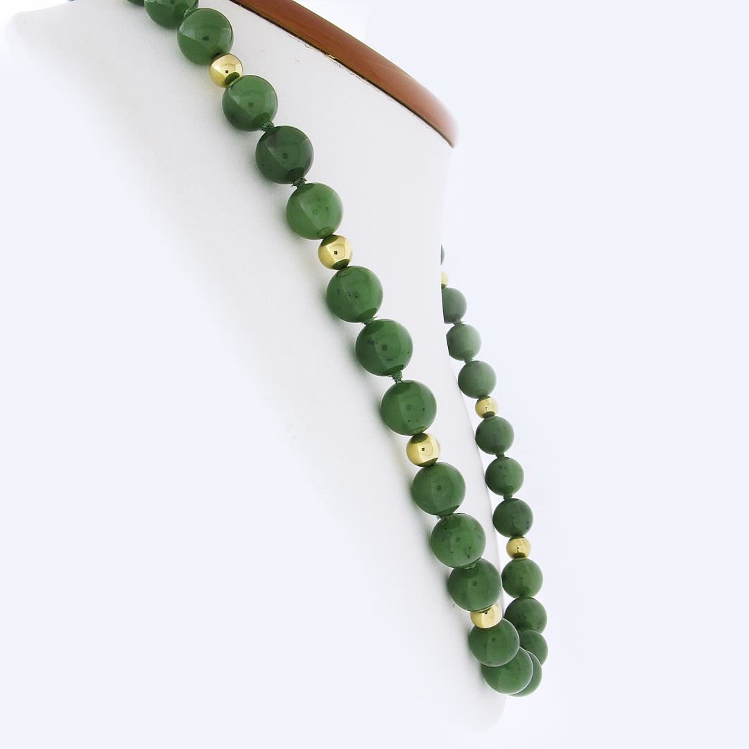 A vintage solid 14k yellow gold bead strand necklace, with 56 GIA graded round bead shape natural nephrite jade ((55) 9.77-10.3+mm each & (1) 5.1mm). It weighs a total of 95.50 grams, measures 10.3mm wide, and measures 29 inches in length. Comes with all original relevant certifications.