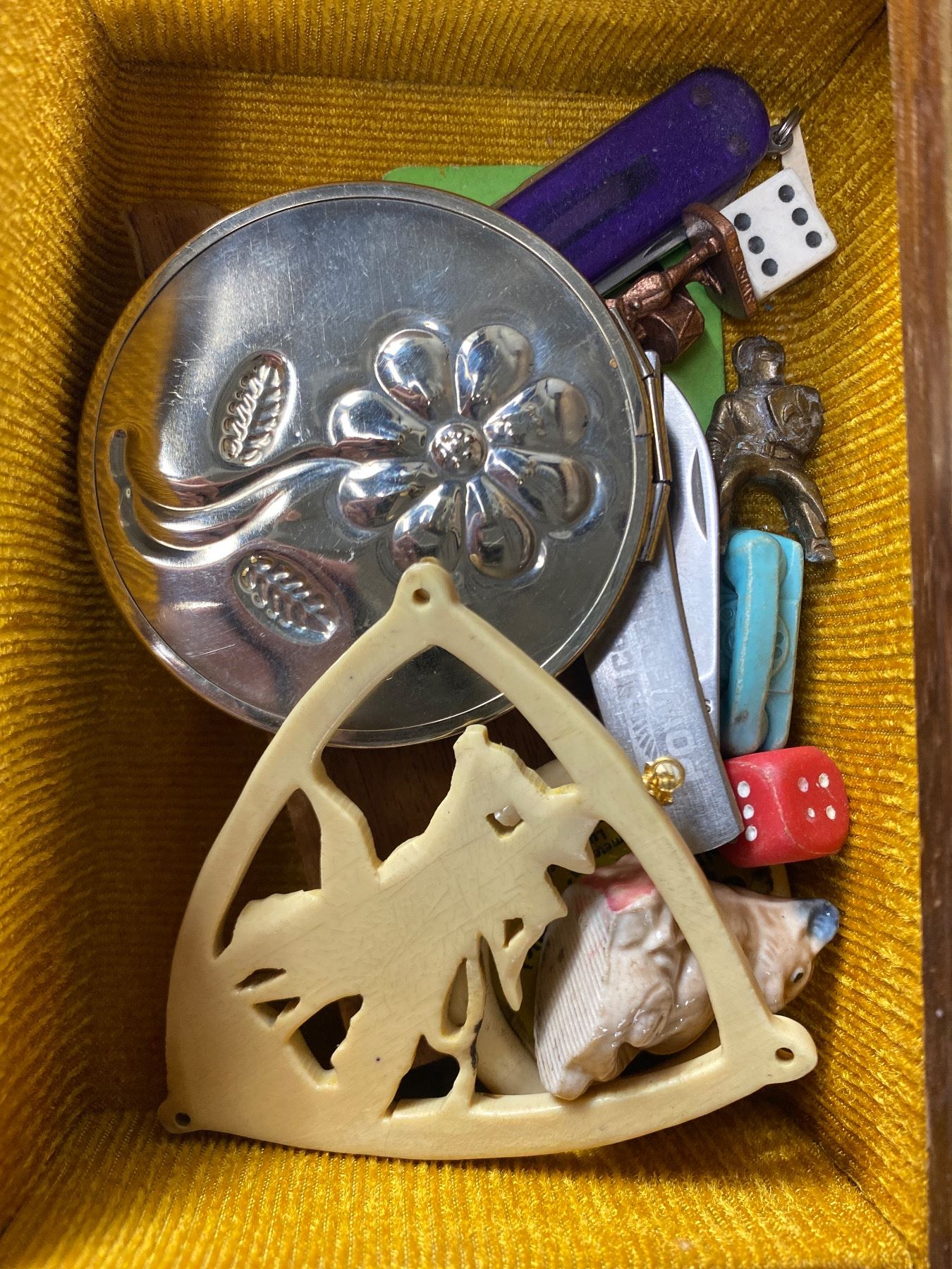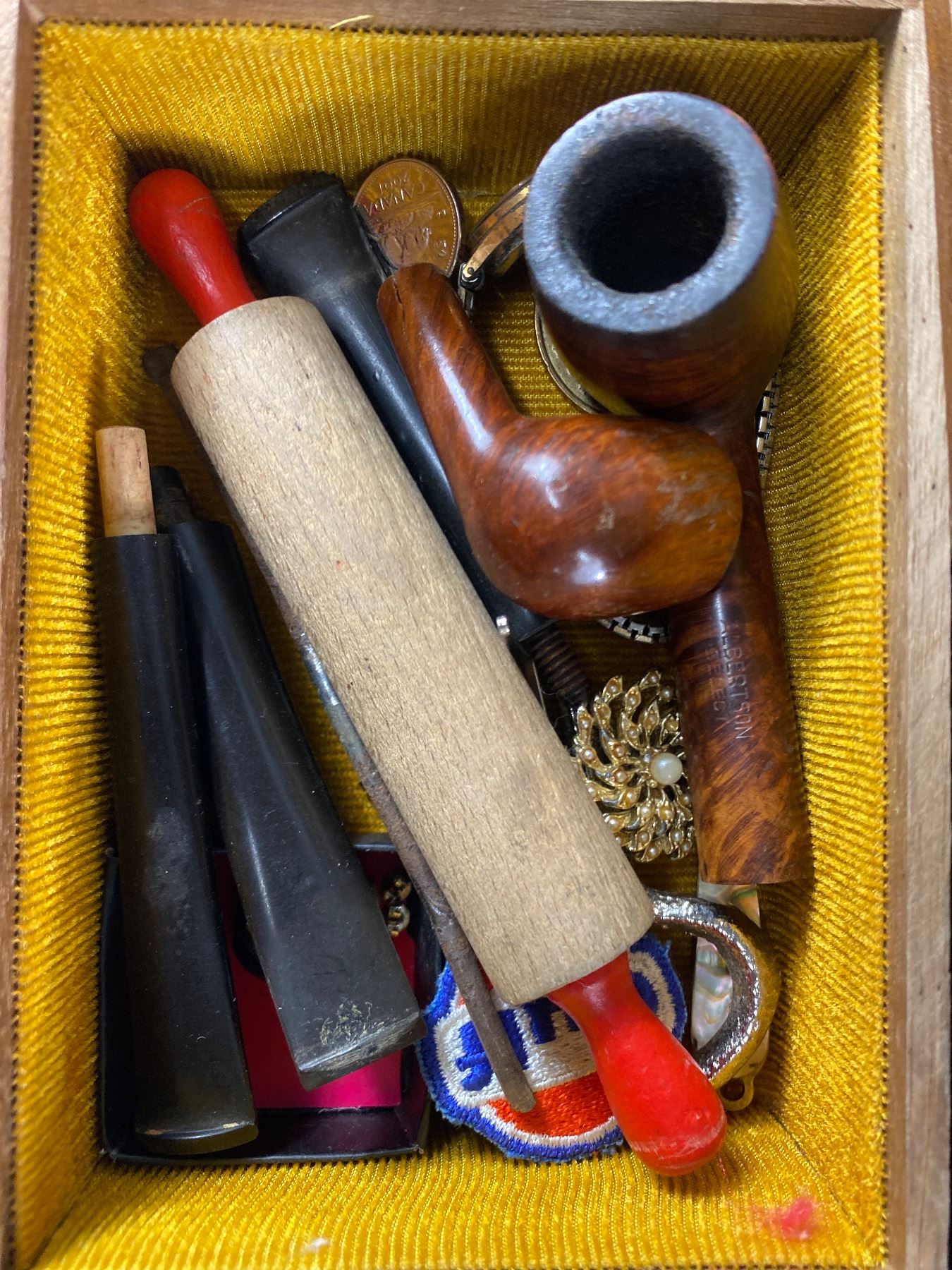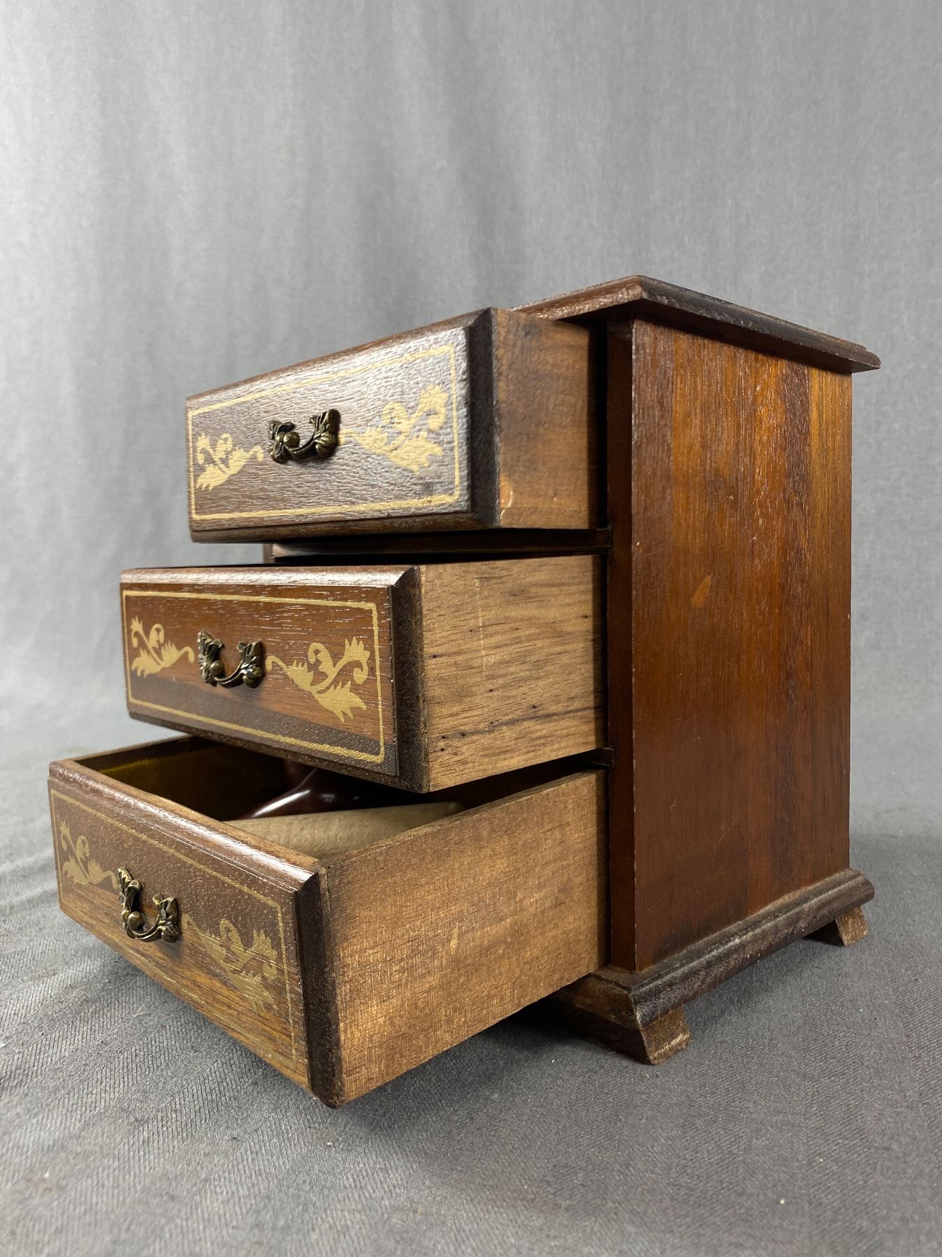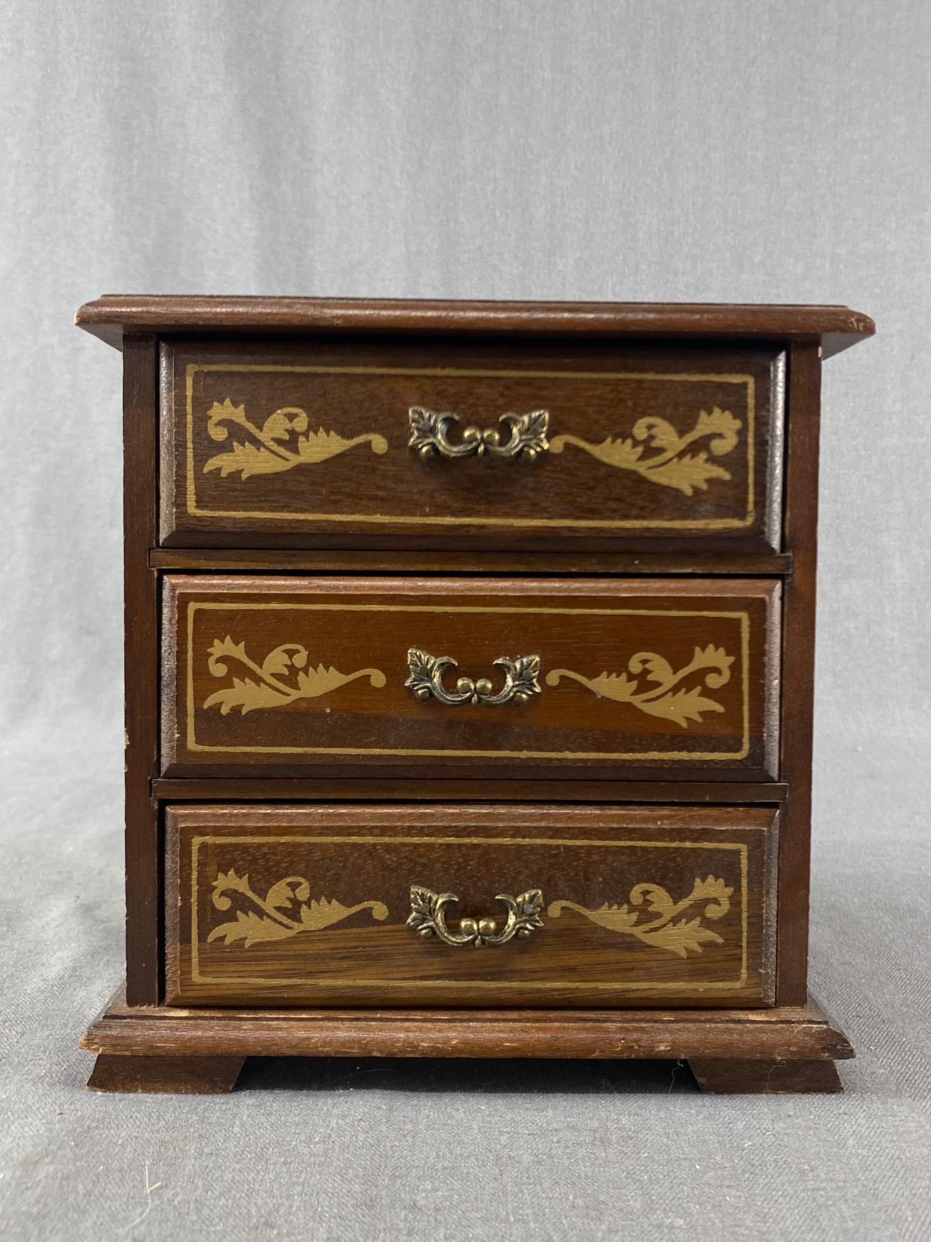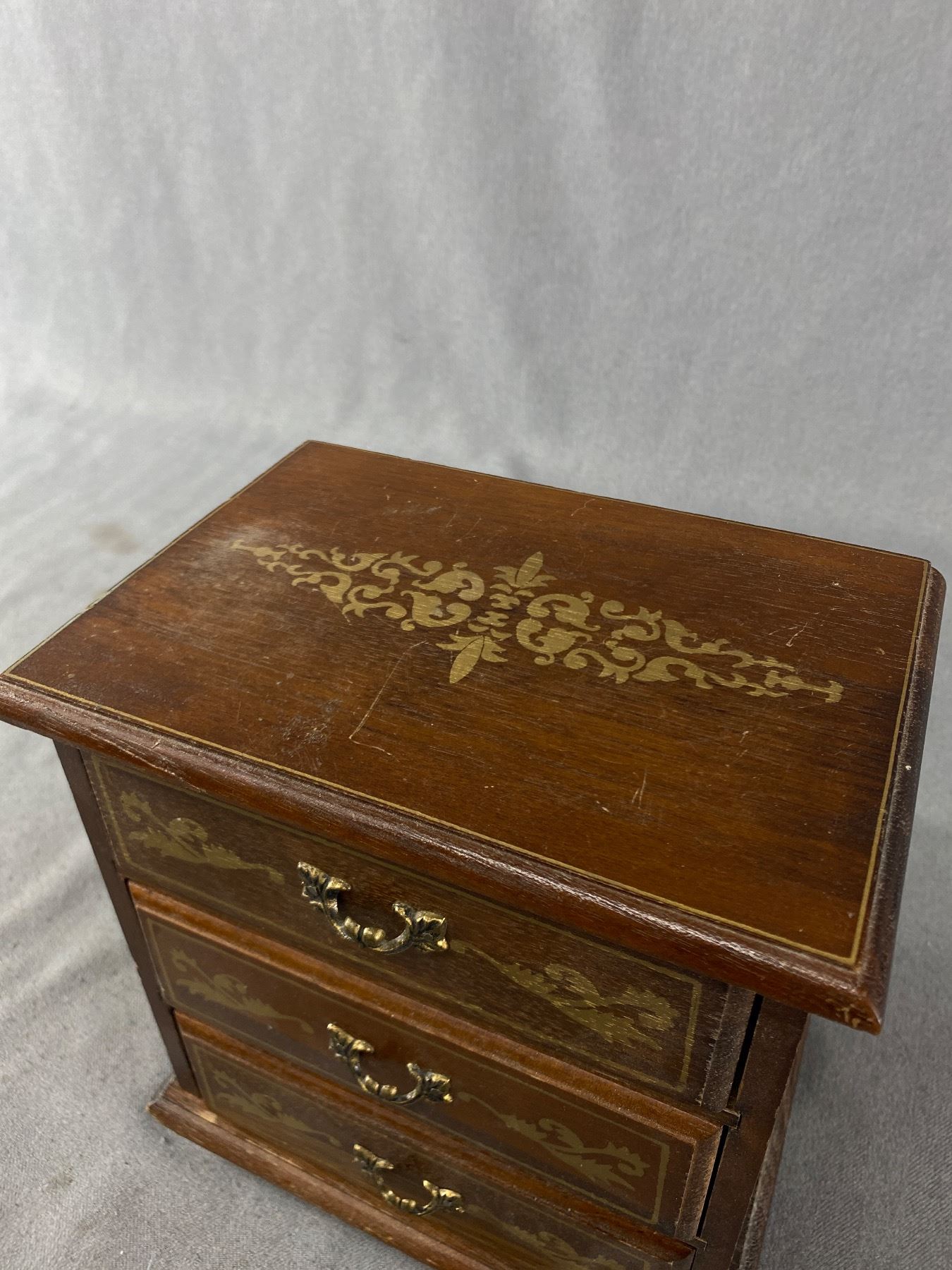Vintage 3 Drawer Wood Jewelry Box w/ Contents. Approx. 8" x 5" x 7.5"