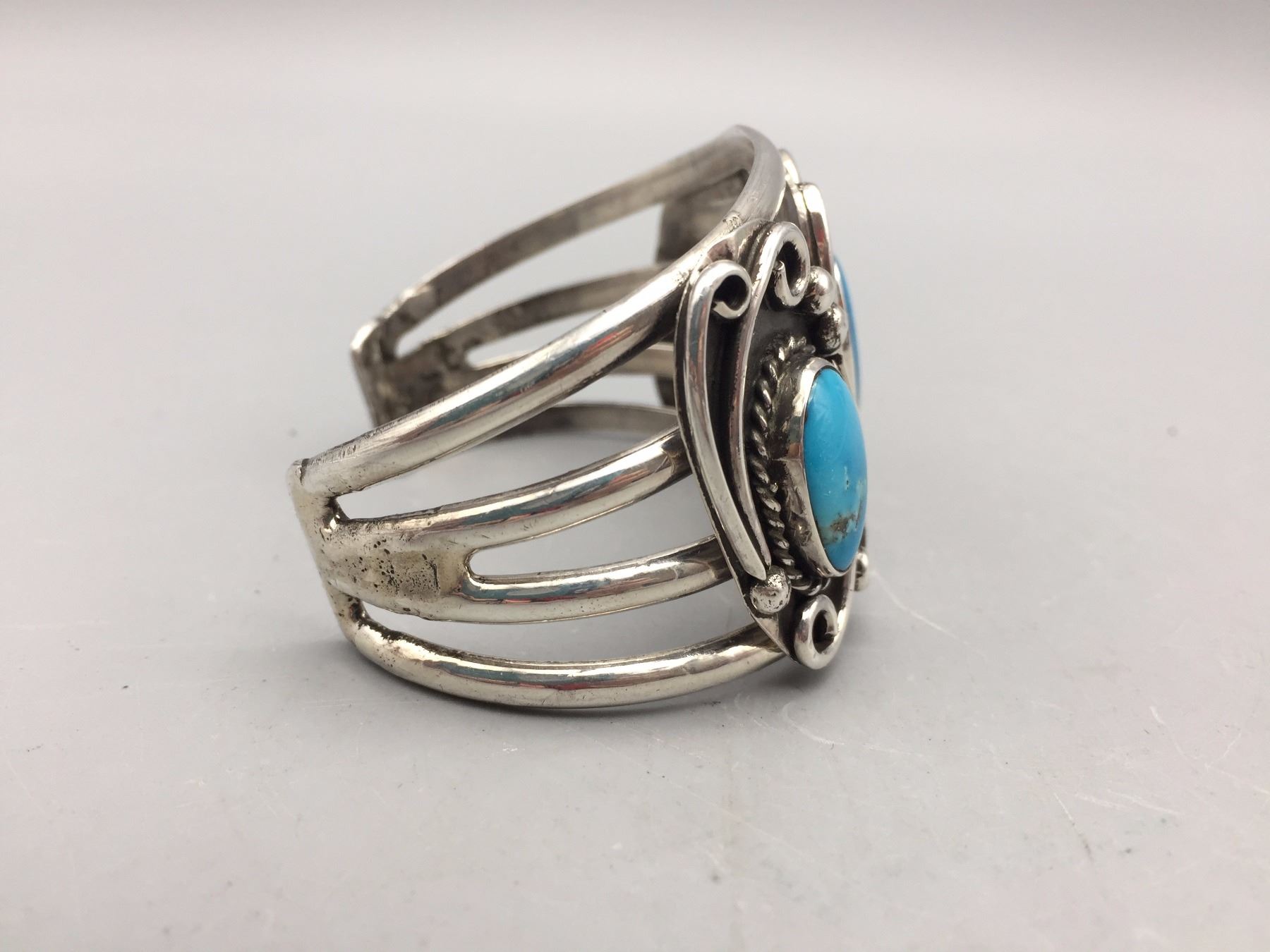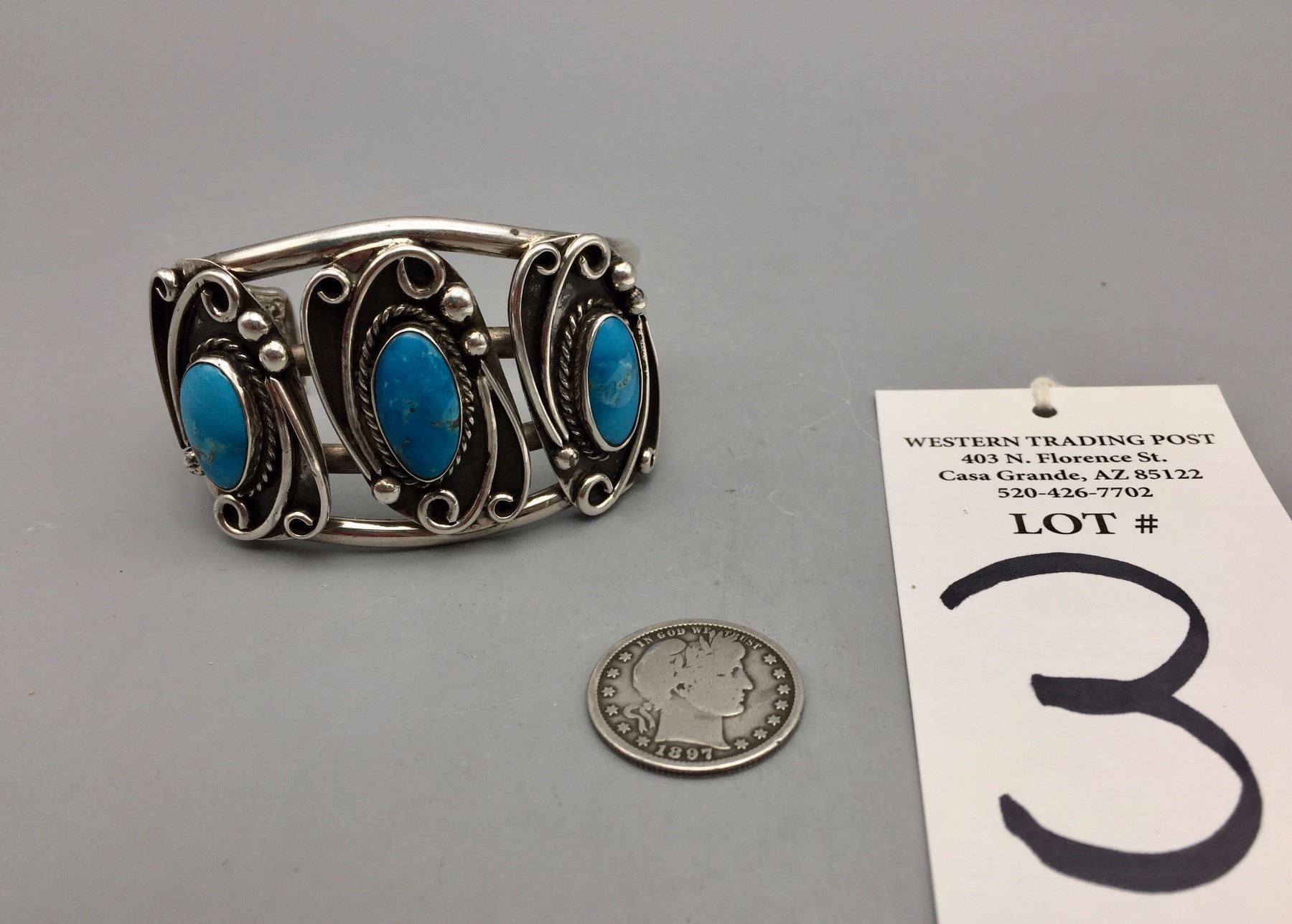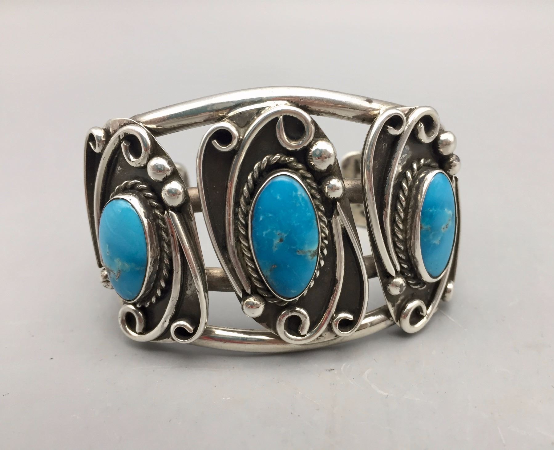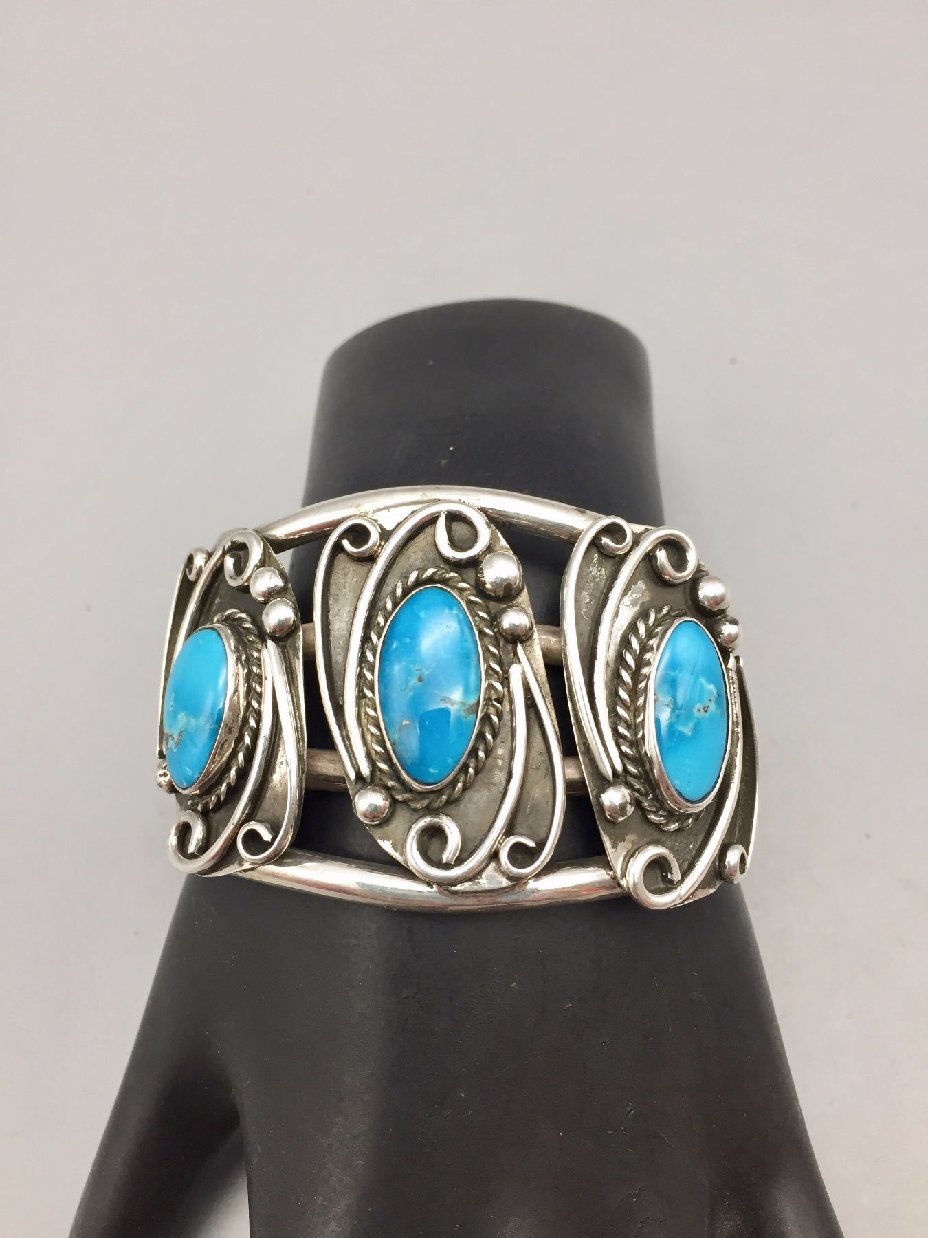 Description: Vintage 3-stone turquoise bracelet with intricate sterling silver appliqué. Tested as sterling silver. Maker: No hallmark. Approx. Age: Circa 1960s - 70s. Size: Measures 5-1/4” with a 1-3/8” opening, (fits a 6-7/8” wrist). Weighs 66.8 grams. Condition: Good for its age, normal wear expected. Please look closely at the pictures - they are an important part of our description. Shipping: There will be a $5 handling / packaging fee for shipping this lot. The actual cost of postage will be added on top of that.