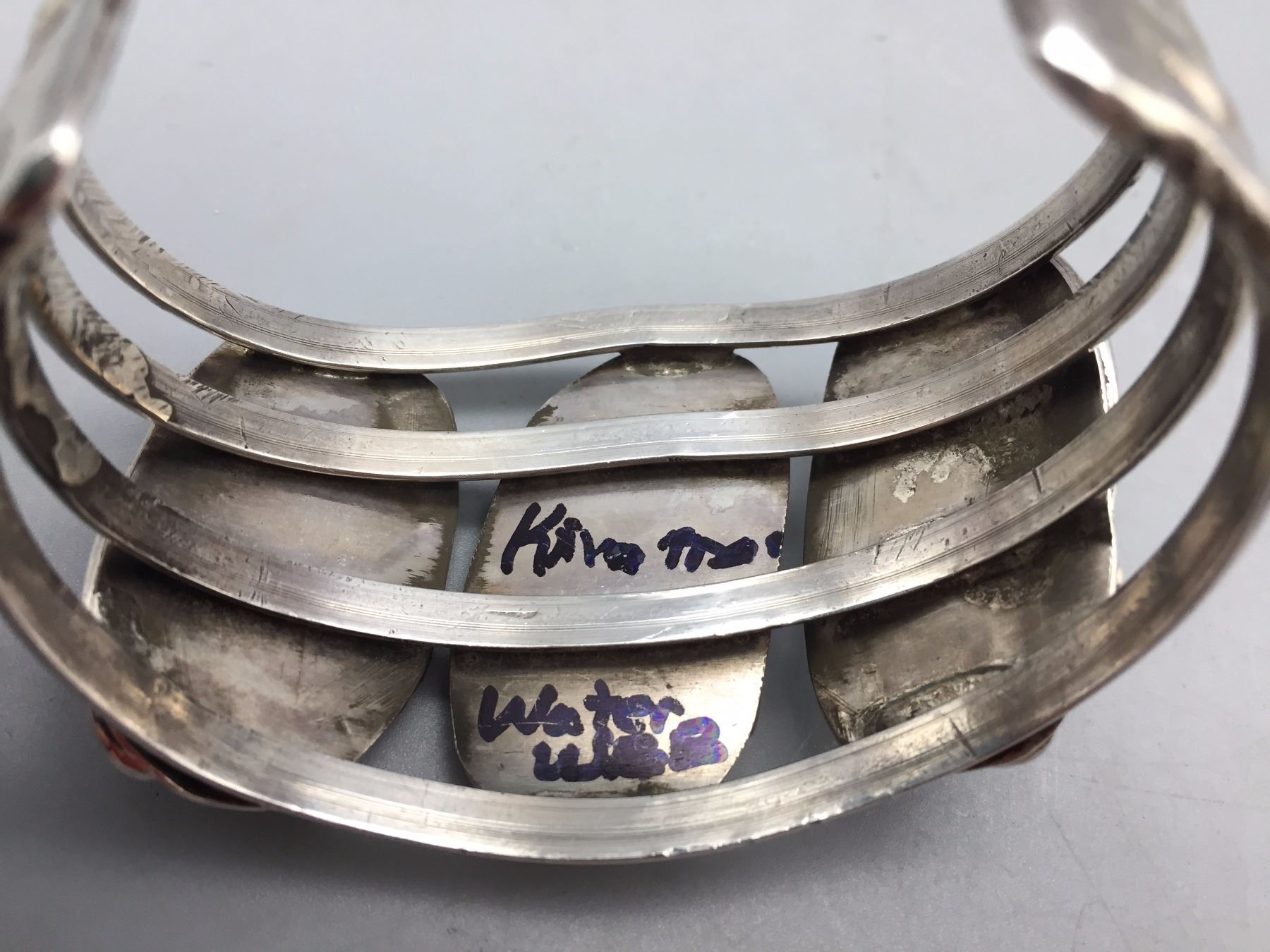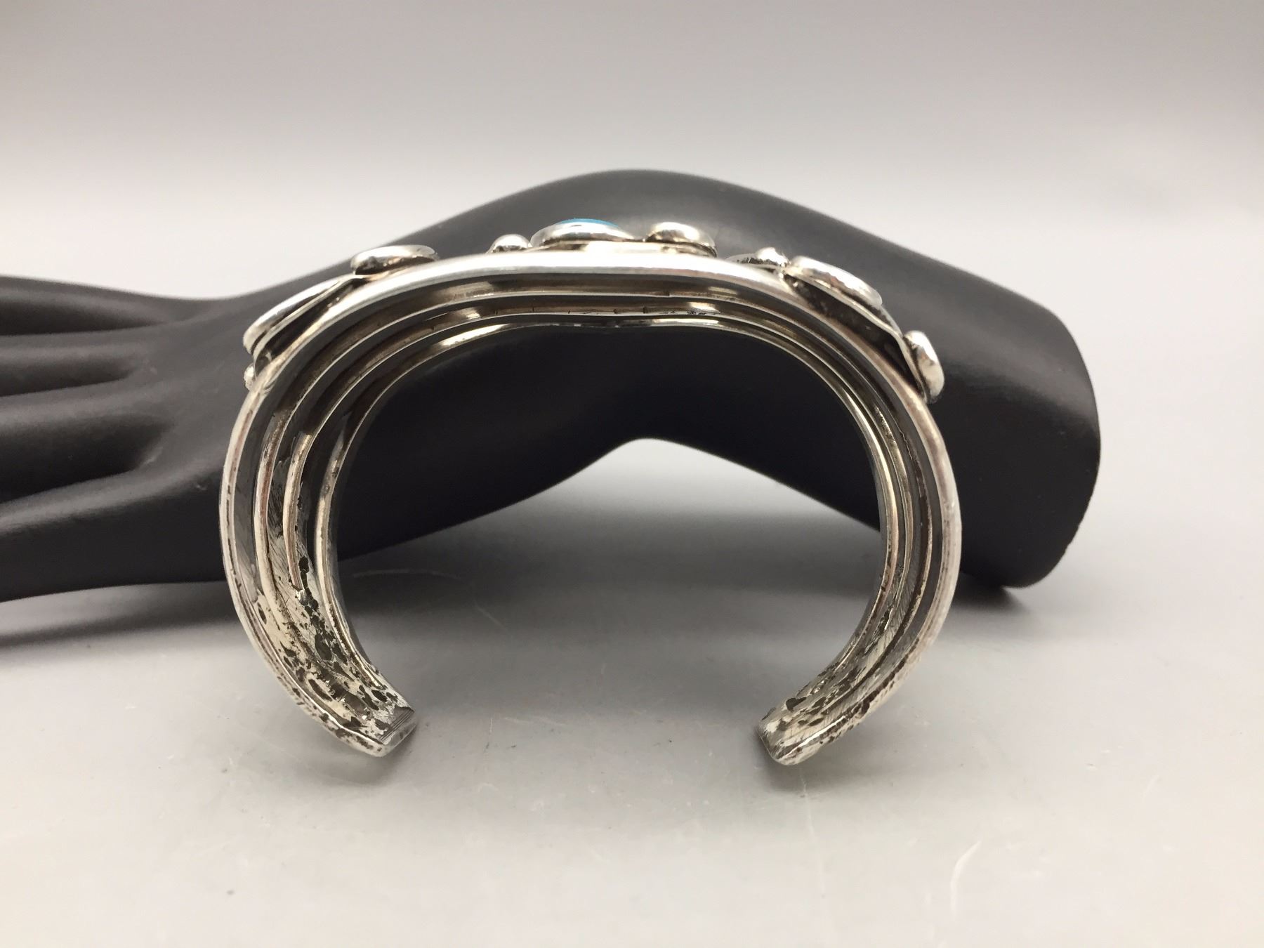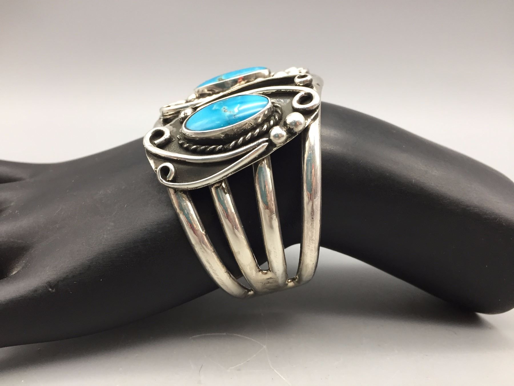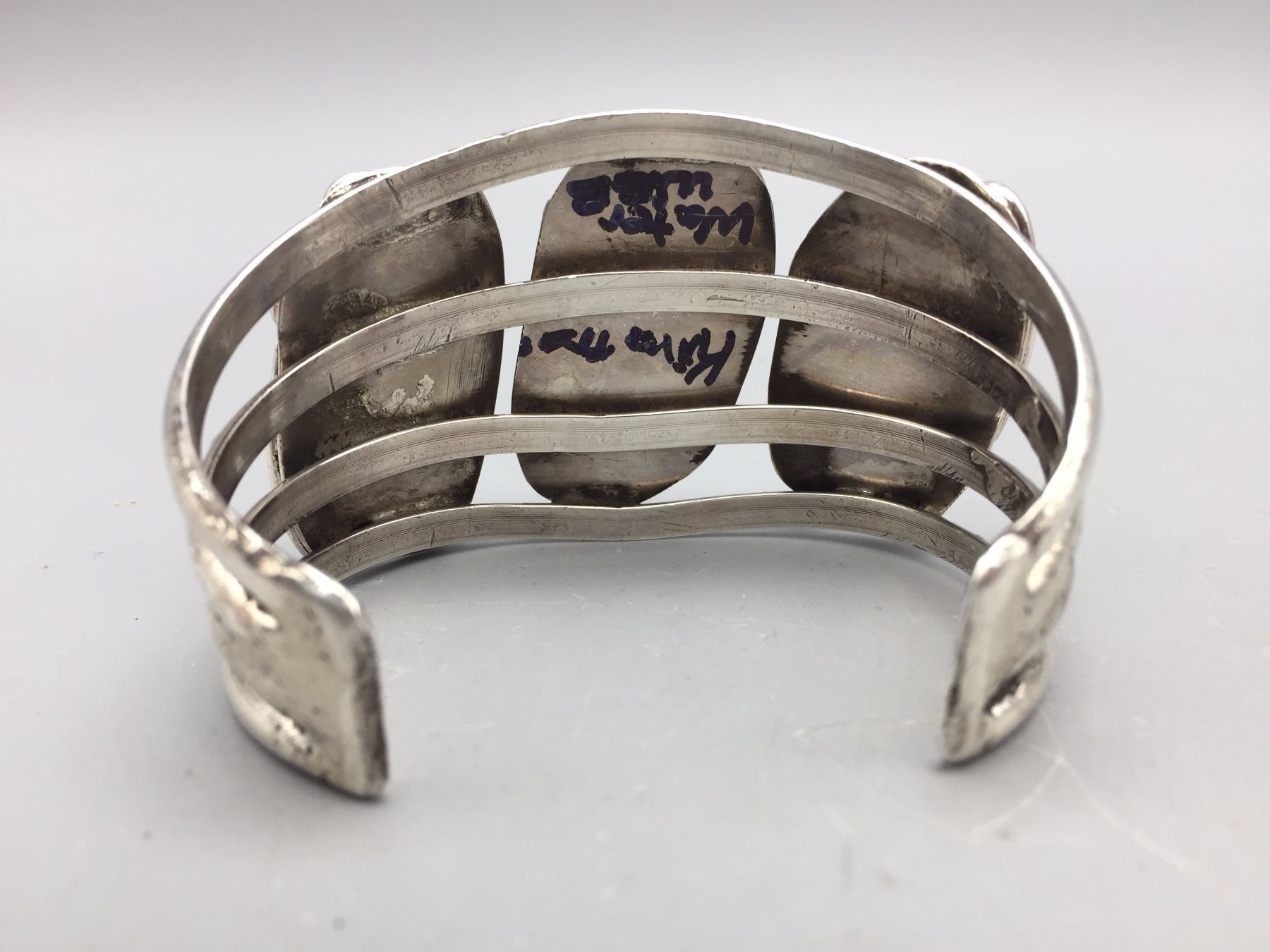 Description: Vintage 3-stone turquoise bracelet with intricate sterling silver appliqué. Tested as sterling silver. Maker: No hallmark. Approx. Age: Circa 1960s - 70s. Size: Measures 5-1/4” with a 1-3/8” opening, (fits a 6-7/8” wrist). Weighs 66.8 grams. Condition: Good for its age, normal wear expected. Please look closely at the pictures - they are an important part of our description. Shipping: There will be a $5 handling / packaging fee for shipping this lot. The actual cost of postage will be added on top of that.
