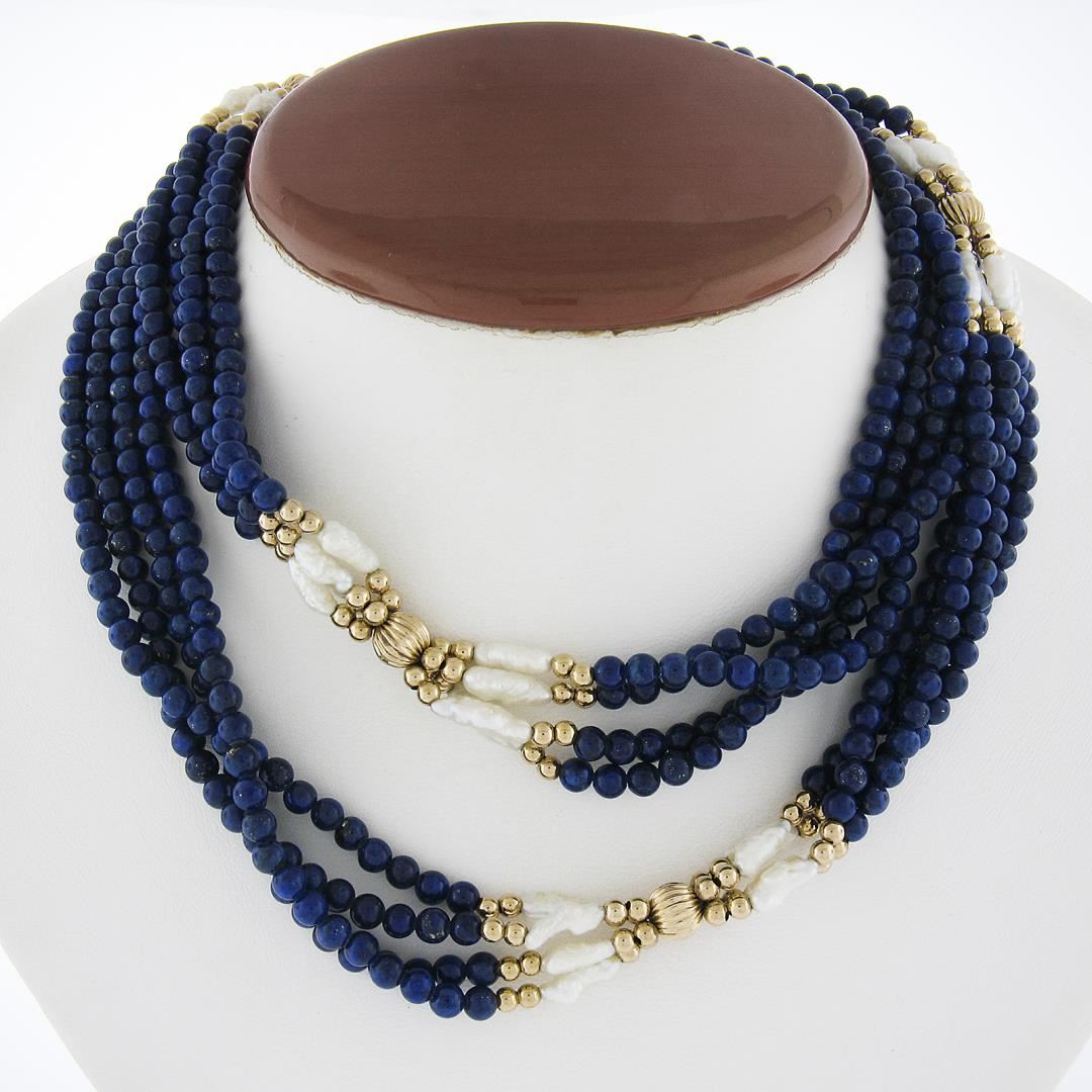 A vintage multi strand necklace, featuring numerous bead natural blue lapis (4-4.2mm each), 32 bead cultured fresh water pearls (8-10mm each), and 14k yellow gold beads & clasp. It weighs a total of 70.39 grams, and measures 31 inches in length.