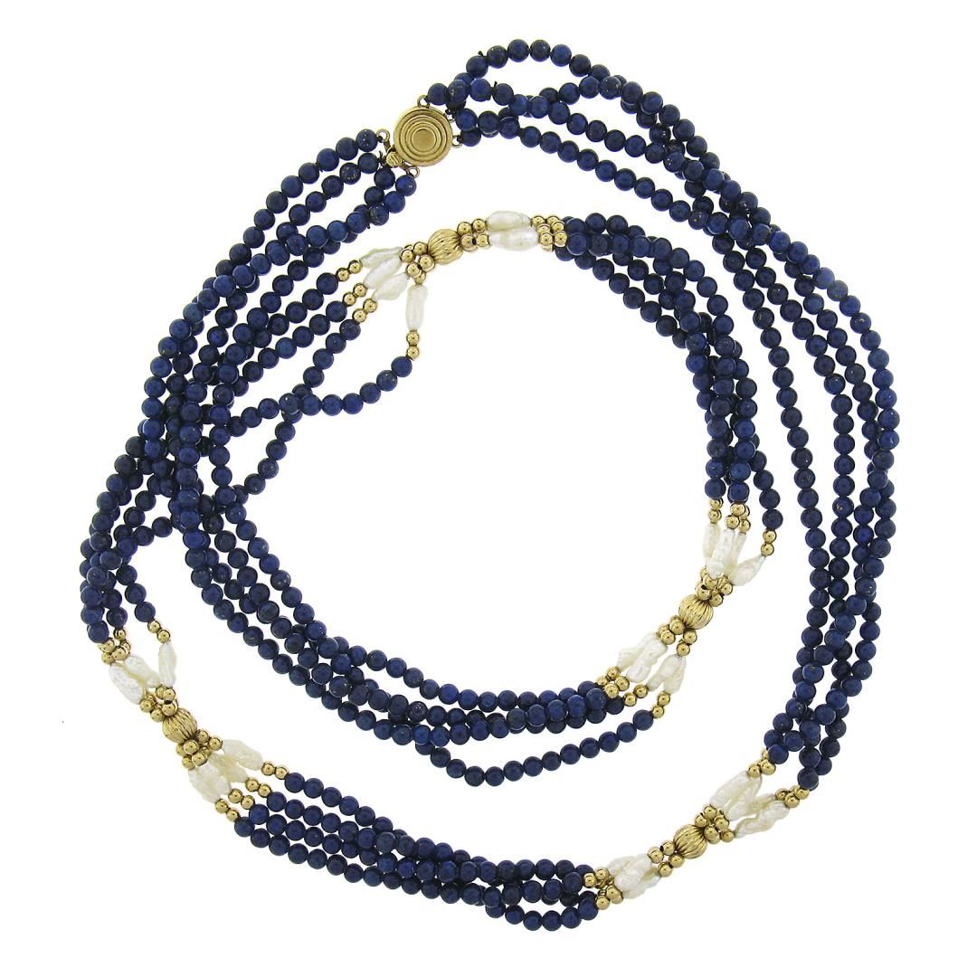 A vintage multi strand necklace, featuring numerous bead natural blue lapis (4-4.2mm each), 32 bead cultured fresh water pearls (8-10mm each), and 14k yellow gold beads & clasp. It weighs a total of 70.39 grams, and measures 31 inches in length.