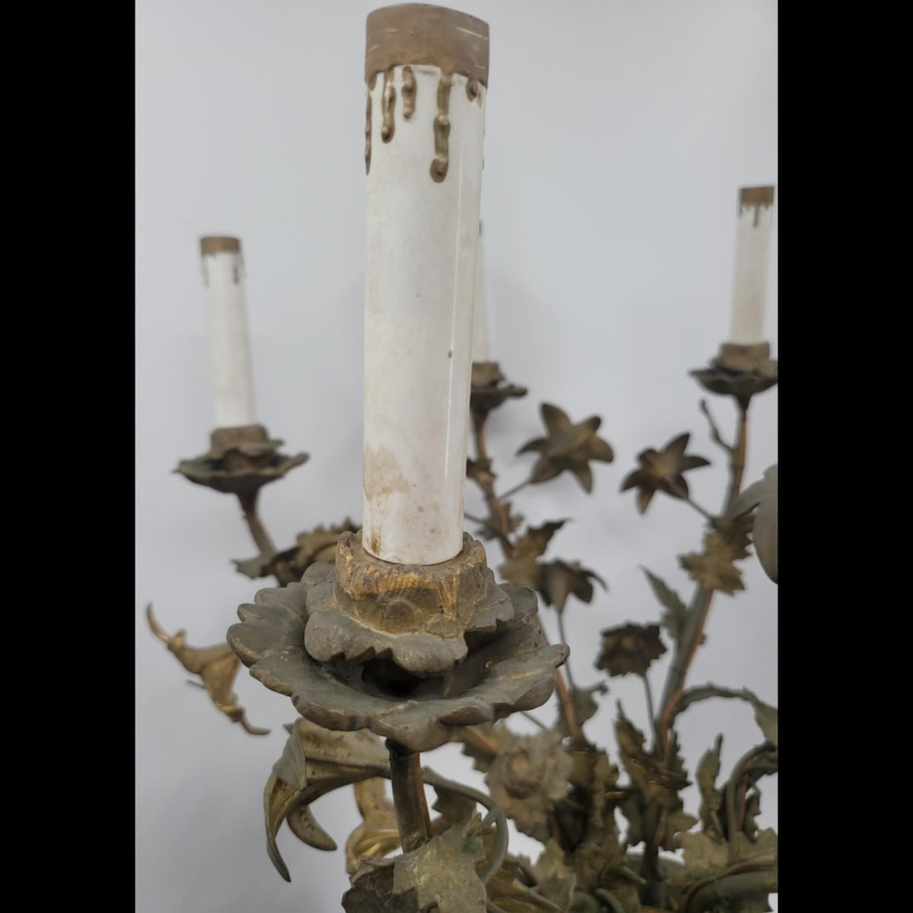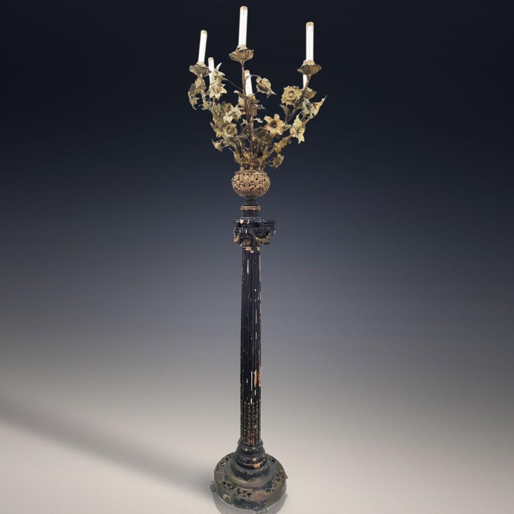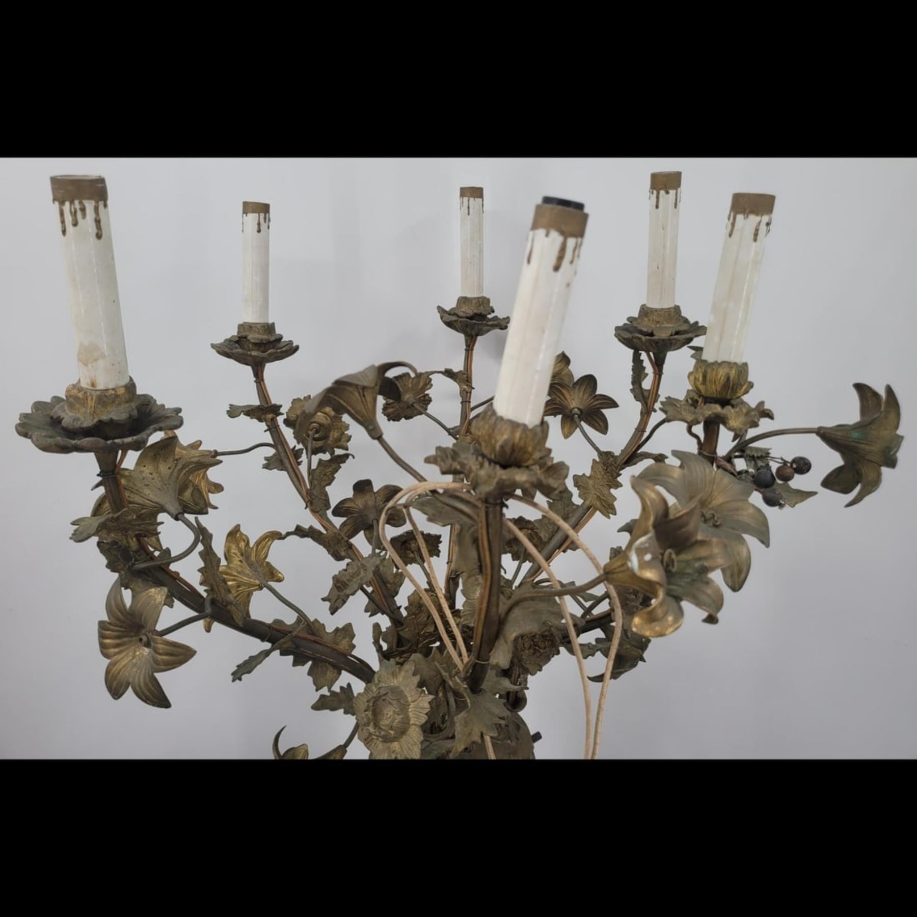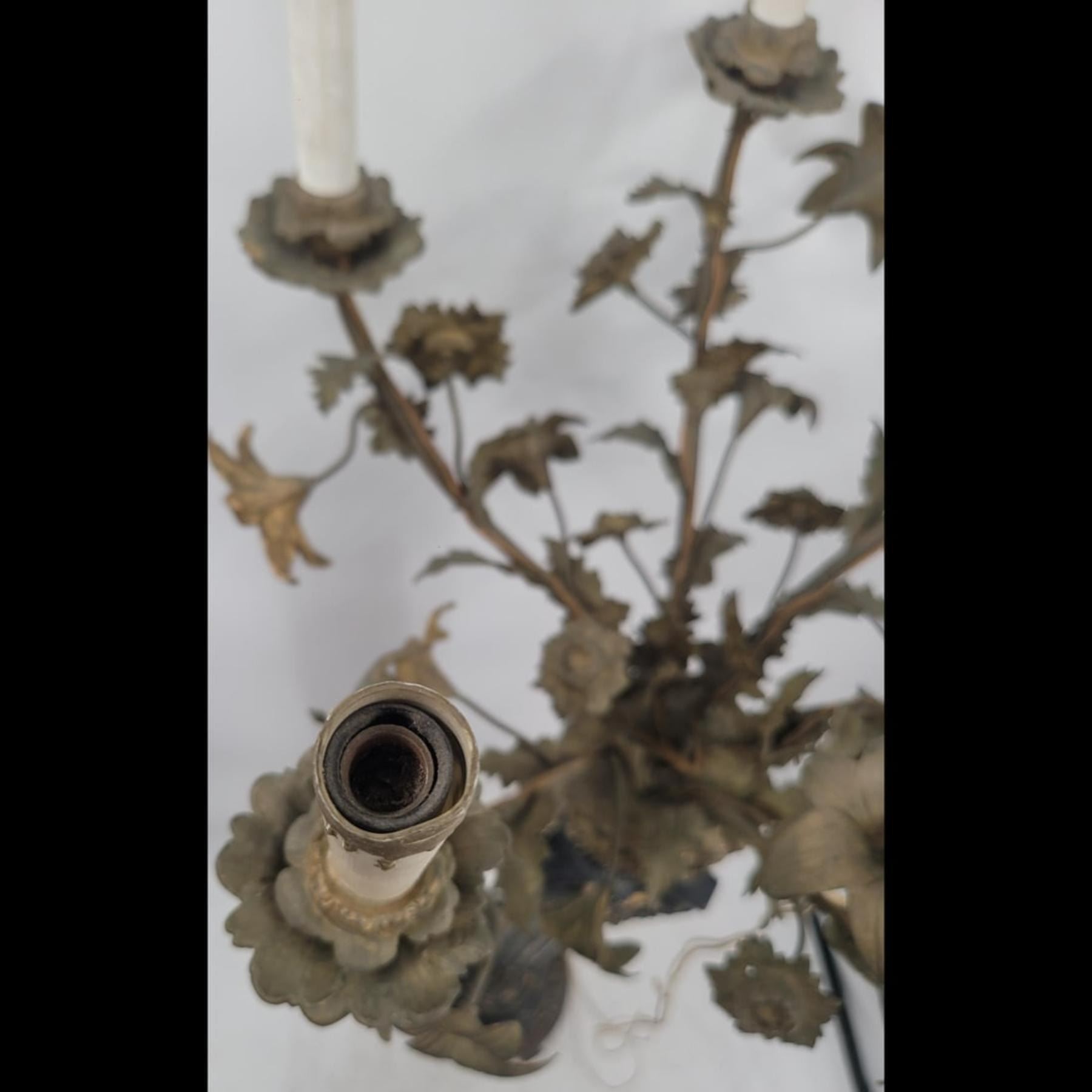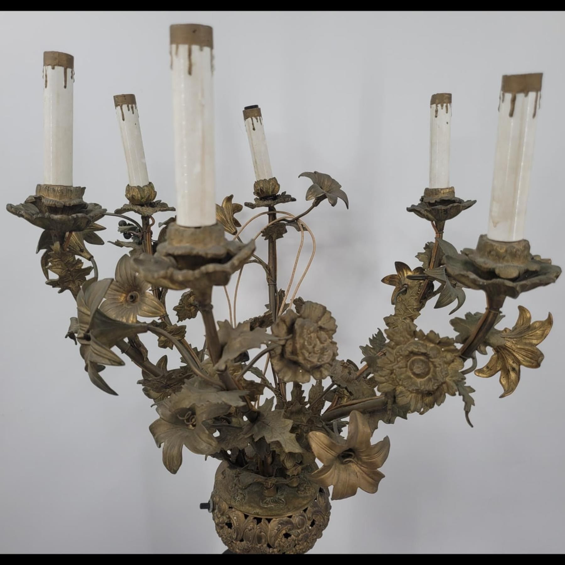 Vintage 5 Arm Floral Candelabra Style Standing Lamp. Lamp post paint is chipping, please see pictures. Some pieces that attach to the flowers are missing. Lamp measures approx. 63" X 21" X 21".