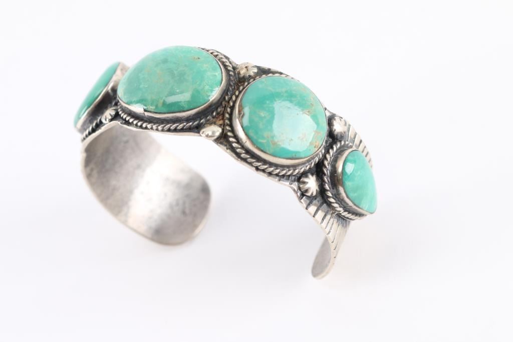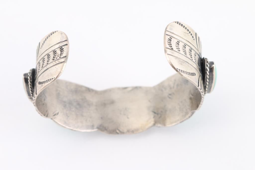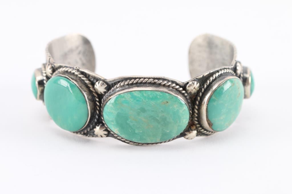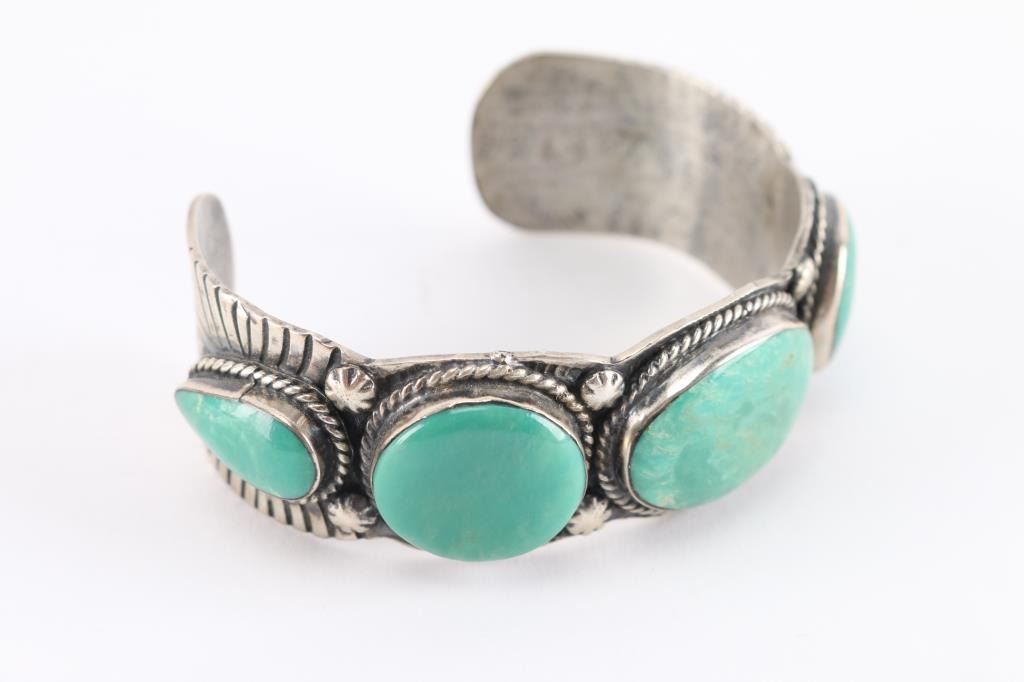 Beautiful vintage blue/green turquoise sterling cuff. No makers mark. Measures 22" including gap.