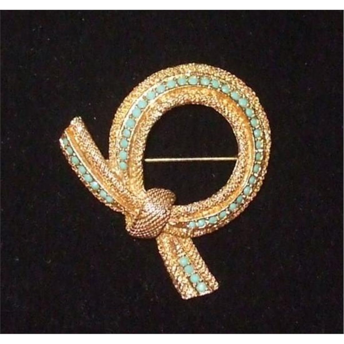 Vintage 50s - 60s Designer SPHINX #9660 Gold Turquoise Round Brooch, Round Goldtone ~ 1-1/4in Diameter, Turquoise Stones Marked on Back 9660, mwf1836