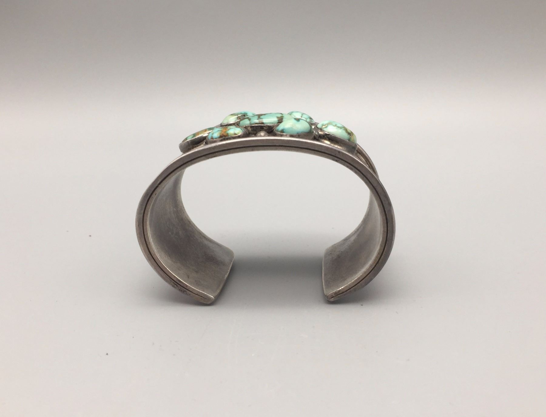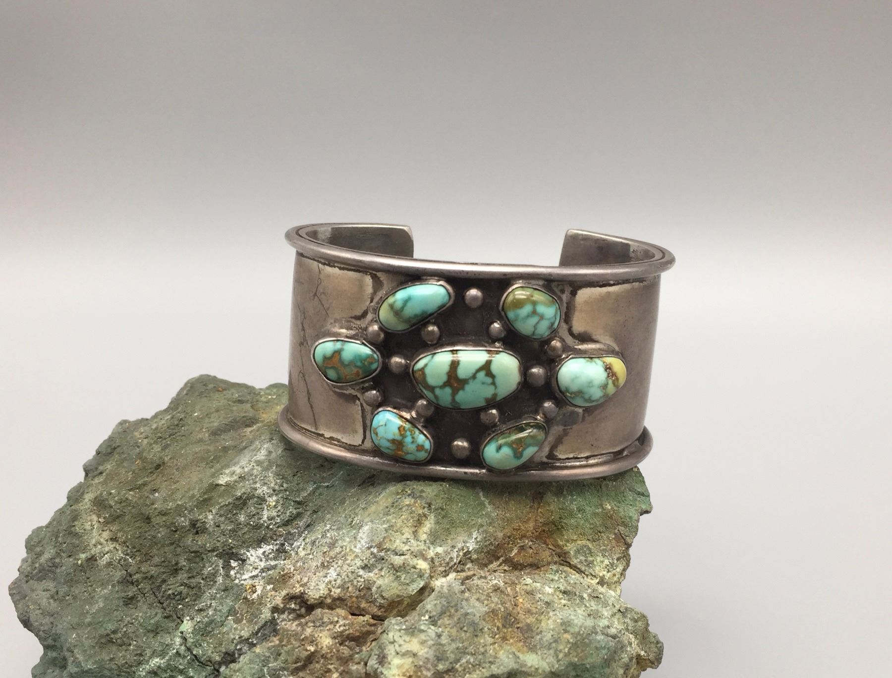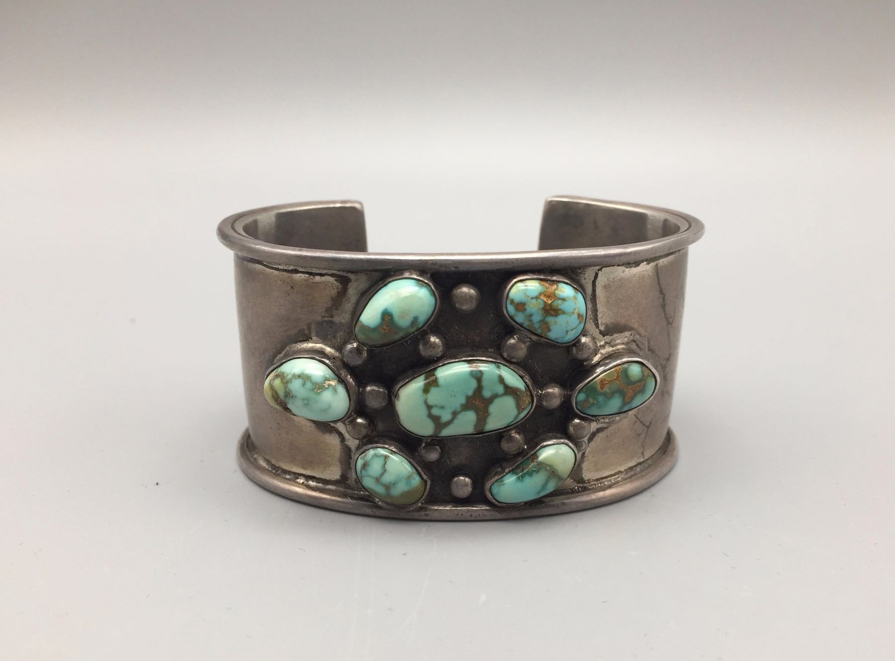 Maker: Unmarked, but vintage Navajo style. Approx. Age: Circa 1970s. Size: Inside circumference measures 5 7/8” with an additional 1 1/8” opening, (fitting a 7” wrist) approx. 1 1/2” wide and weighs 99.4 g. Additional Info: A vintage, retro-style, 7-stone turquoise bracelet with nice turquoise. Condition: Good for it’s age, normal wear expected. Please look closely at the pictures - they are an important part of our description. Shipping: There will be a $5 handling / packaging fee for shipping this lot. The actual cost of postage will be added on top of that.