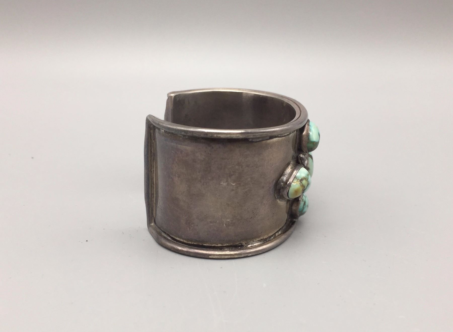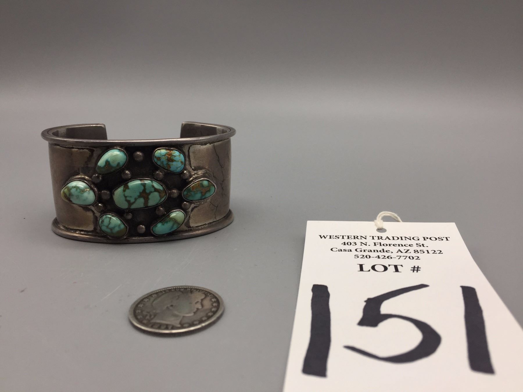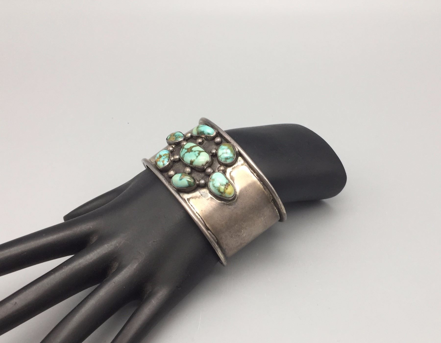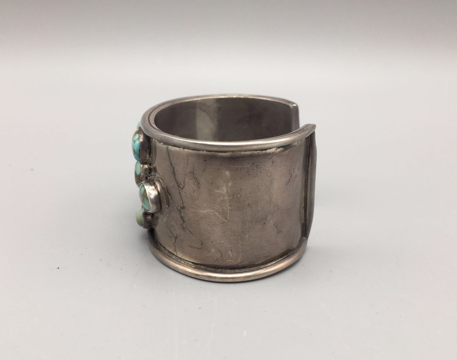 Maker: Unmarked, but vintage Navajo style. Approx. Age: Circa 1970s. Size: Inside circumference measures 5 7/8” with an additional 1 1/8” opening, (fitting a 7” wrist) approx. 1 1/2” wide and weighs 99.4 g. Additional Info: A vintage, retro-style, 7-stone turquoise bracelet with nice turquoise. Condition: Good for it’s age, normal wear expected. Please look closely at the pictures - they are an important part of our description. Shipping: There will be a $5 handling / packaging fee for shipping this lot. The actual cost of postage will be added on top of that.