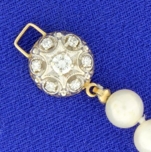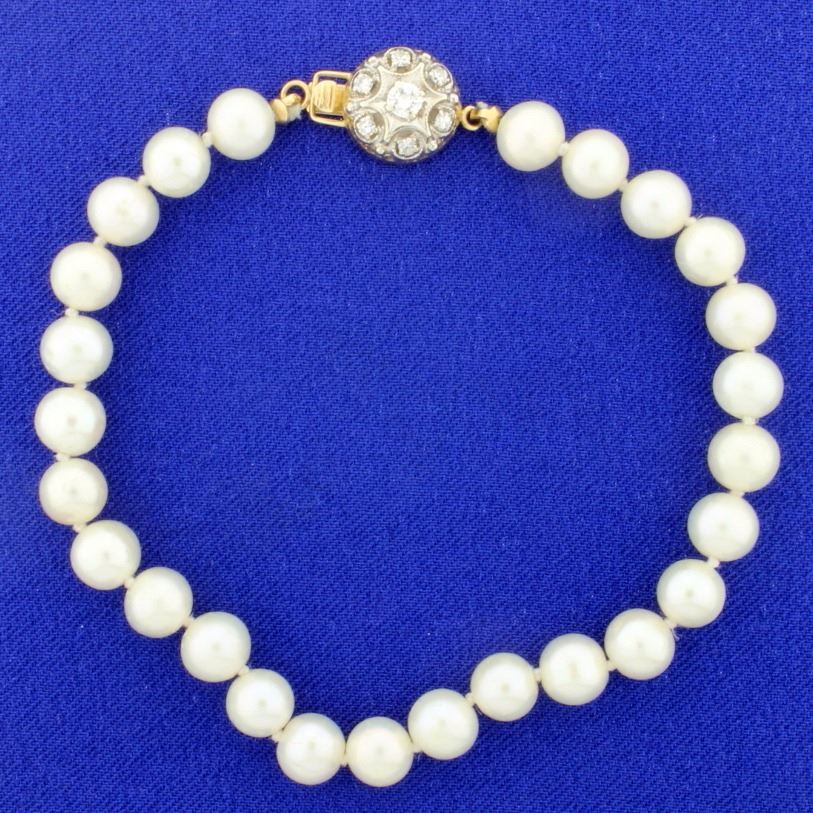 14K yellow gold clasp. The bracelet contains twenty six 6.4mm pearls. The clasp contains a 1/4 ct TW of diamonds - center diamond of .12ct surrounded by six .02ct- all high quality. 12.2g