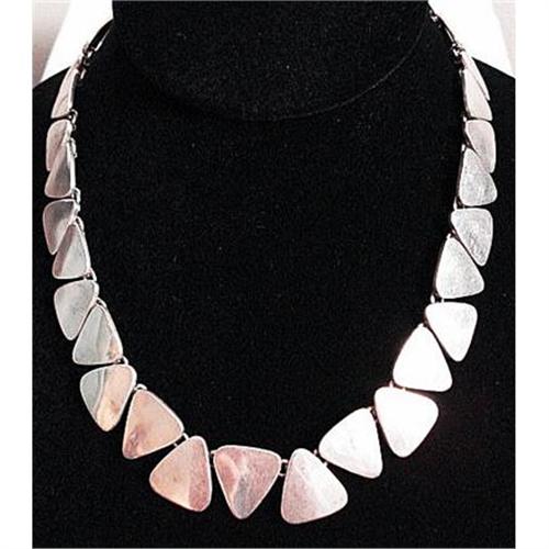 This is a Triangle Link Necklace made by JS or TS-22 (22nd smith w/ last name beginning with S in the city of Taxco) c. 1980s. Looks great around the neck the way the triangles move together. Excellent uncleaned condition. Might never have been worn (from a private collection). Signed as pictured. Combined shipping available.