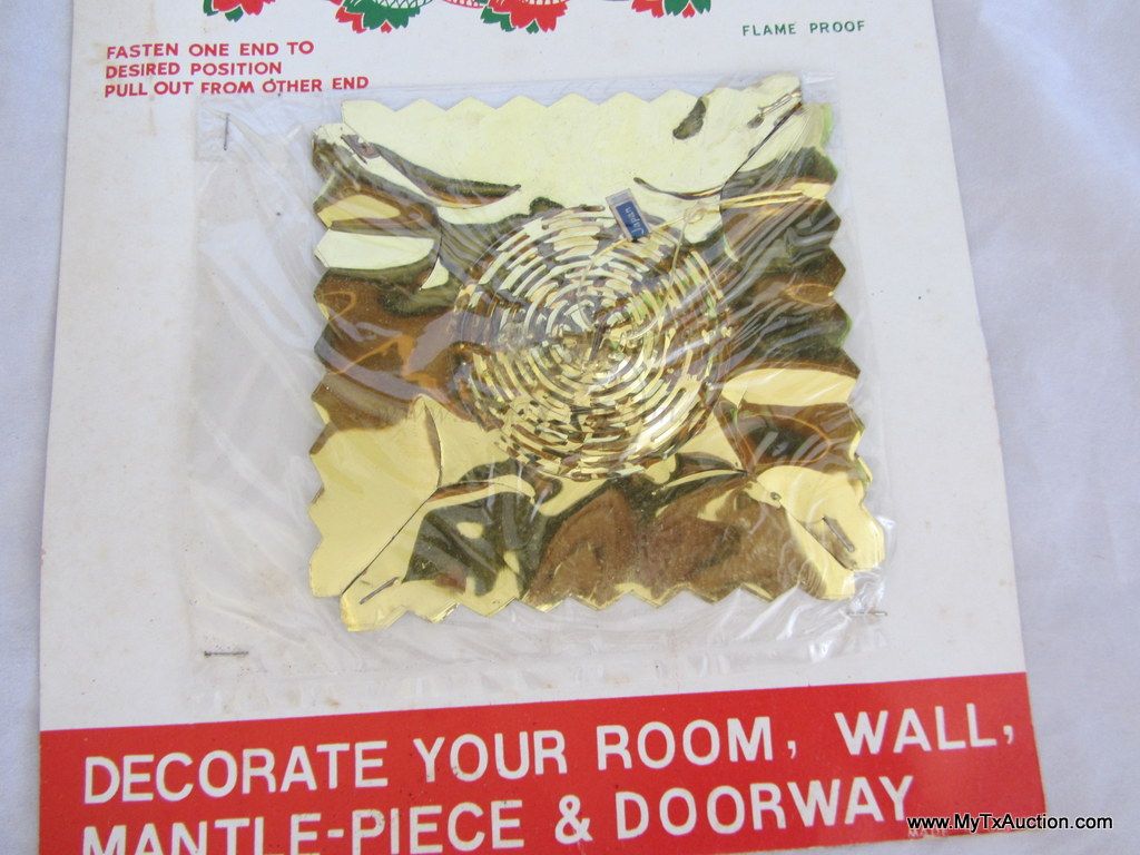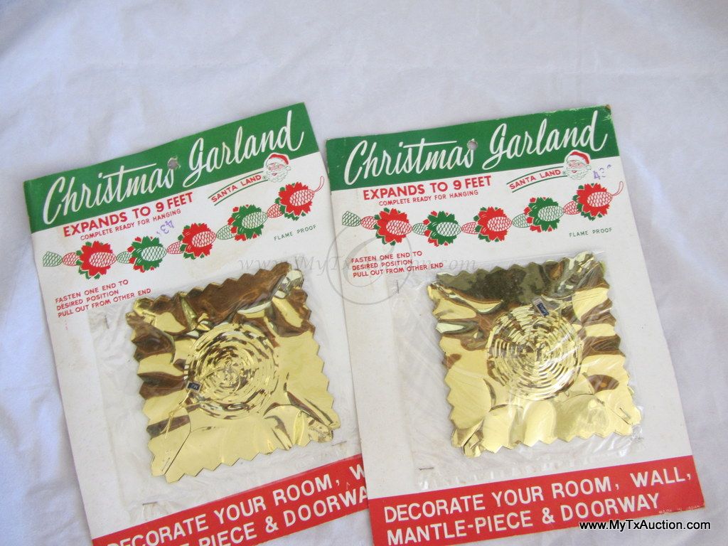 Matching pair of gold colored 9' expandable garland from the 50's-60's. Still in the original package on the original card board. Flame Proof for decorating room, wall, mantle or doorway.