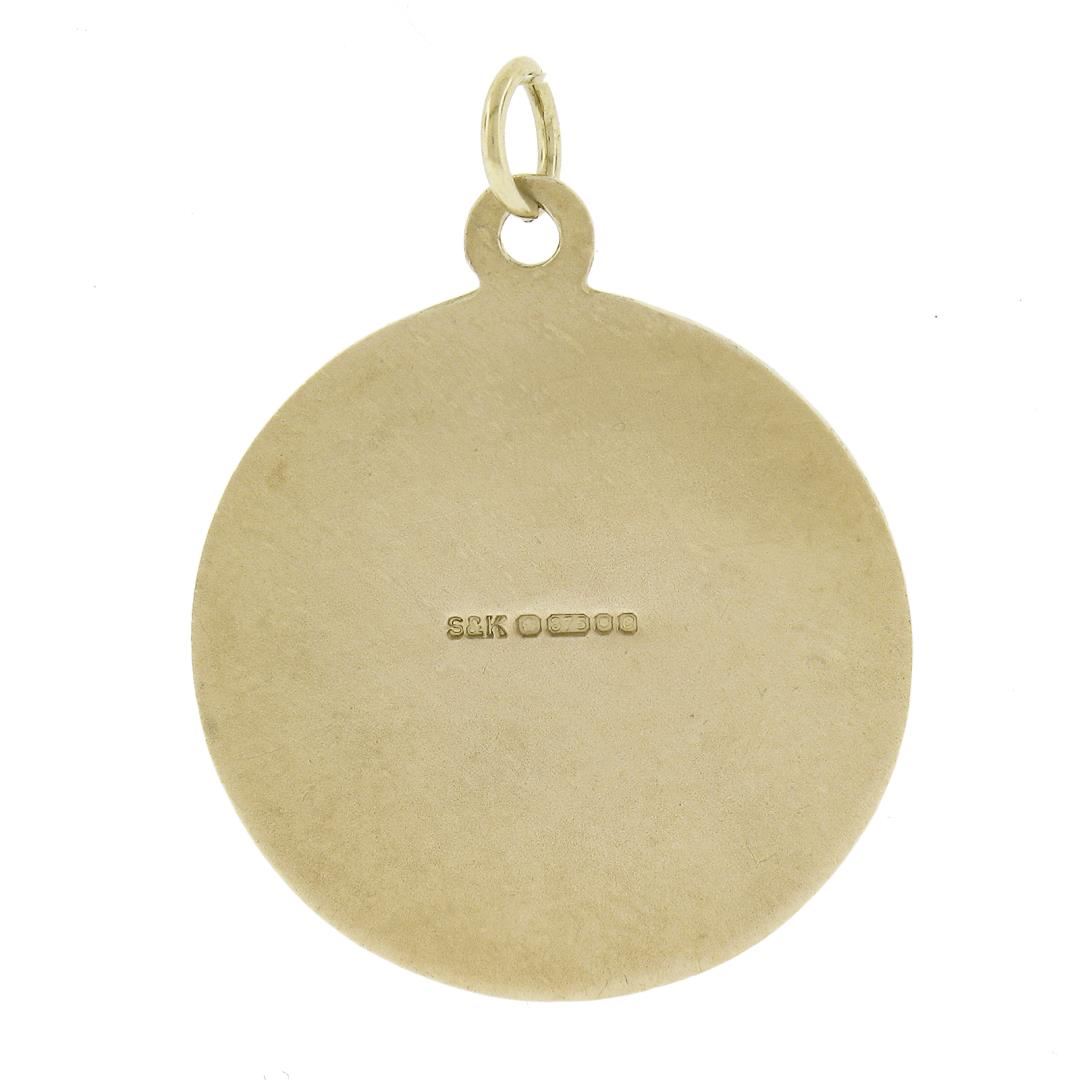 a vintage solid 9k yellow gold medallion pendant. The pendant weighs a total of 4 grams, measures 29.6x22.7mm including the bail, and the inside of the bail measures 2x3.4mm.