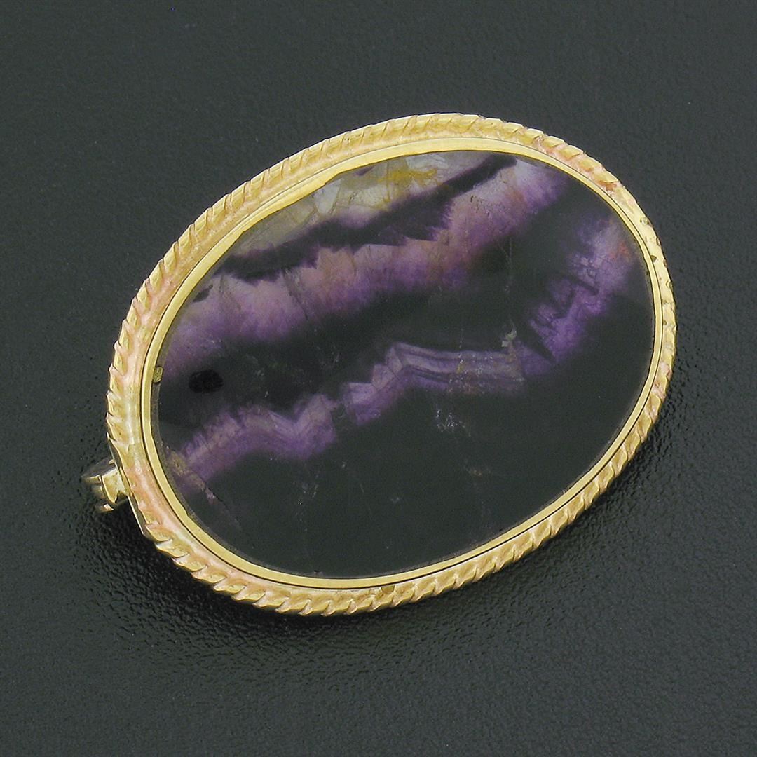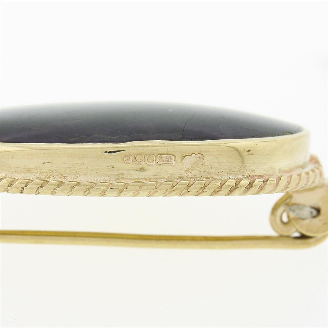 A solid 9k yellow gold pin brooch, with 1 oval shape natural amethyst (25.1x18.5mm). Measures 21.80x28mm and weighs a total of 7.21 grams.