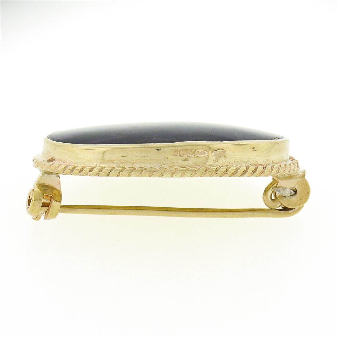 A solid 9k yellow gold pin brooch, with 1 oval shape natural amethyst (25.1x18.5mm). Measures 21.80x28mm and weighs a total of 7.21 grams.