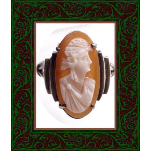 This is one of the prettiest deco rings I have seen in a long time with the stepped and graduated dimensional setting. The woman is quite exquisite and is carved of sardonyx shell. The width is almost 1? long and the ring is a size 6. IT is either white gold or sterling ( not plate or brass).This is a really beautiful piece! In very good condition too.