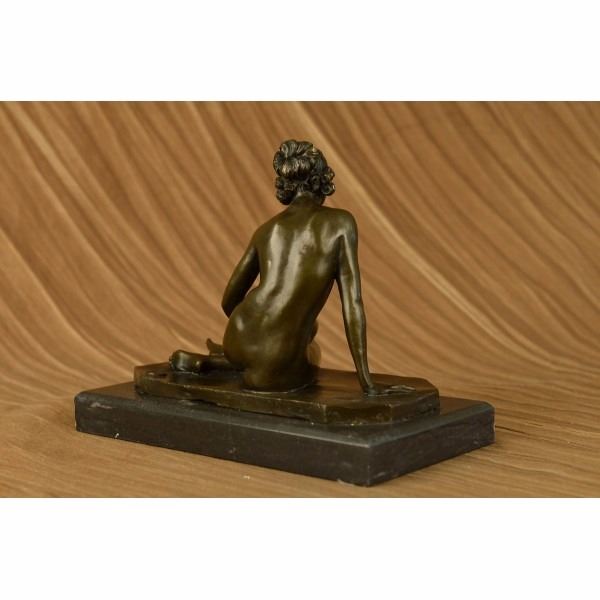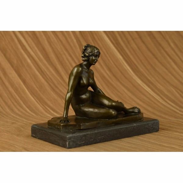 Sitting provocatively yet elegantly, a confident young woman reveals her long curvy legs and fully nude to stir envy amongst other women and to provoke lust amongst men whom indulge her beauty. A figure of feminism, the woman holds tremendous power to draw men to her toes by nothing more than a glimpse of her golden skin, The handmade bronze sculpture was cast using the archaic method of lost-wax casting and stained with a brown patina finish for perpetuation. She is mounted upon a black marble base with the European Bronze Finery stamp of quality. Condition: This sculpture is in perfect condition. Bronze Dimensions with Marble Base:Height 9" x Width 10 1/2" Marble Dimensions:10 1/2" X 6". Height without base: 8" Weight : 12 LBS Inventory:50Y8024205