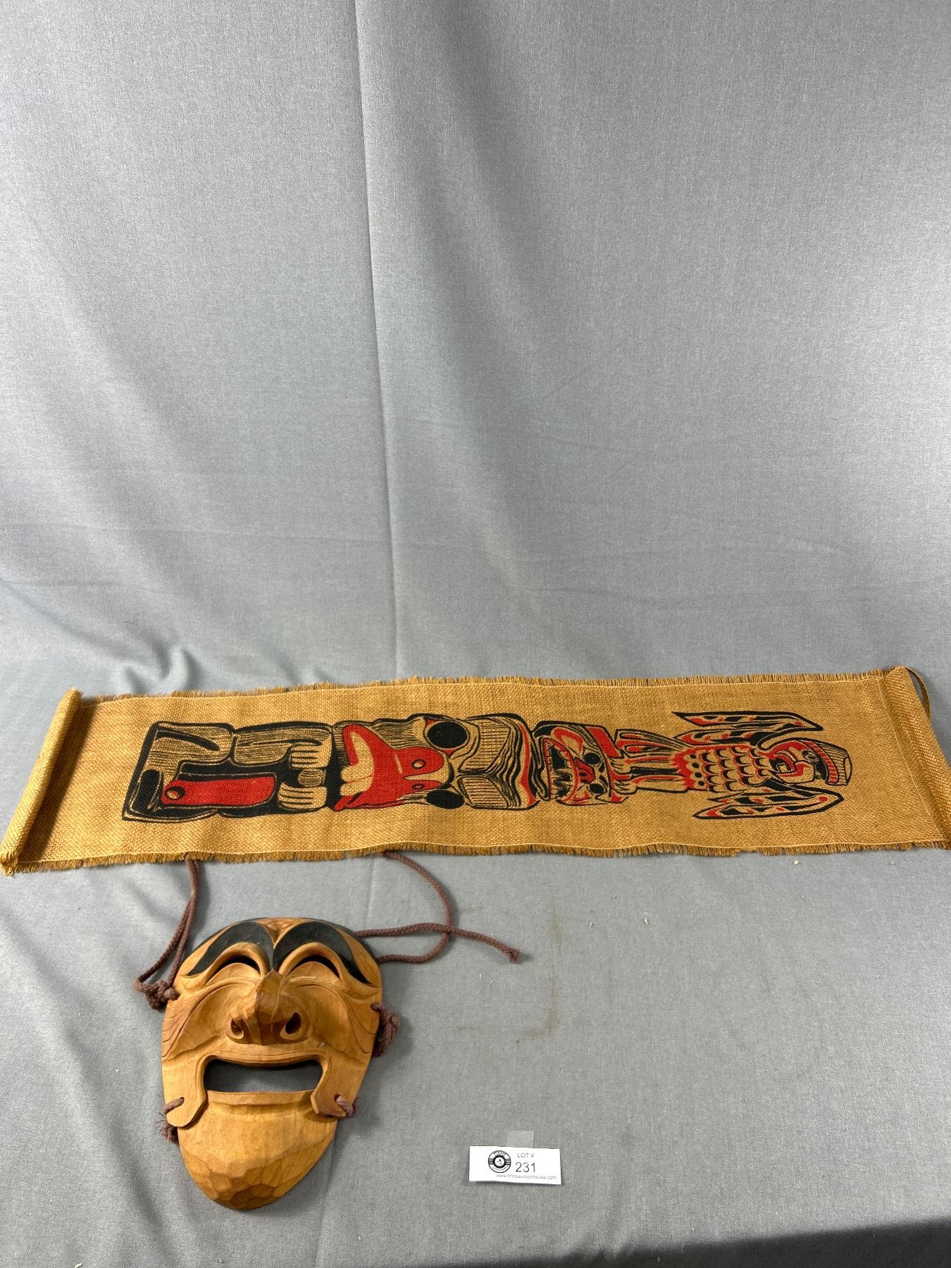 Vintage Aboriginal Lot - Beaver And Eagle Hand Print Scroll On Burlap (Approx. 37" L) & Cedar Hand Crafted Mask.