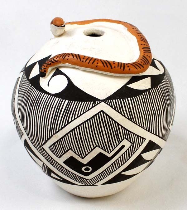 Vintage 1978 Native American Acoma Polychrome Pottery Seed Jar by Eva Histia (1914-2005), embellished with pottery snake (head has been glued; however not professionally), measures 7''H x 6''D and is signed on the bottom, FYI: ''Eva Histia (1914 - 2005) was a member of the Roadrunner Clan at Acoma Pueblo. Eva was an active potter as early as 1922. She was still an active potter as late at 1991 and perhaps later.''