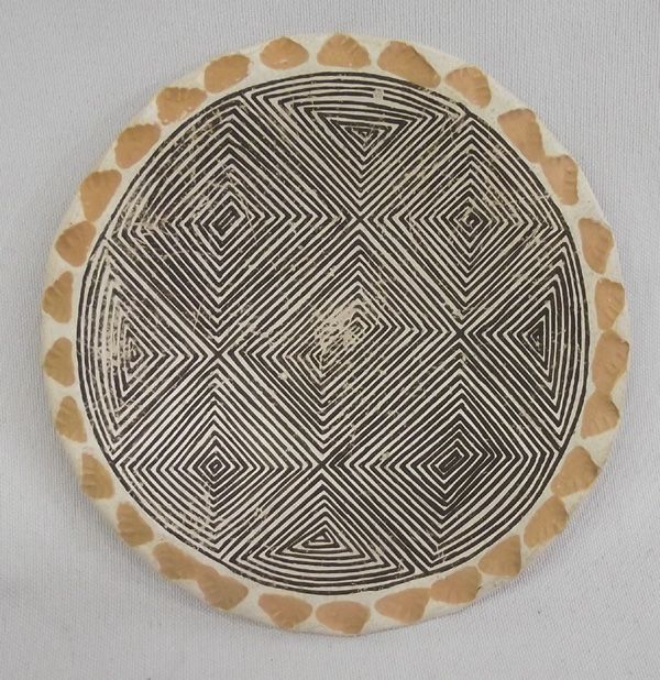 Vintage Acoma Small Plate - Emma Lewis. An eyedazzling pattern of fine lines grace the surface of this plate. The rim has indentions with triangles and the edge is scalloped. Signed on the bottom, ''E. Lewis Acoma'' for the artist, Emma Lewis. Measures 1''H x 5''W.