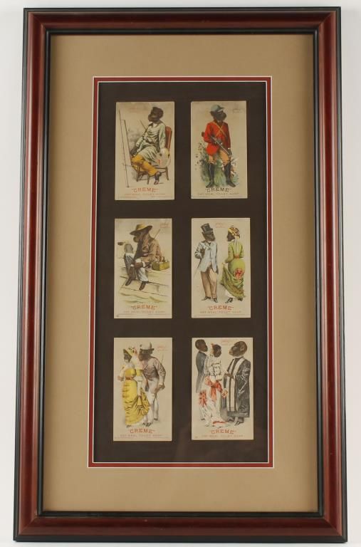 (6) Post cards featuring chimpanzees advertising "Creme Oatmeal Toilet Soap". Circa 1900. Framed and matted 17" wide x 28" high.