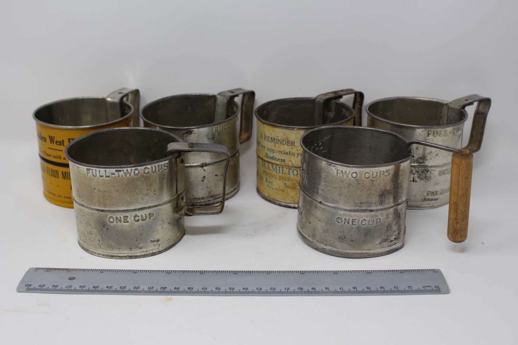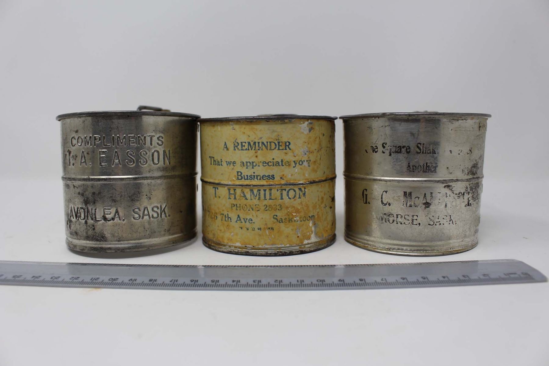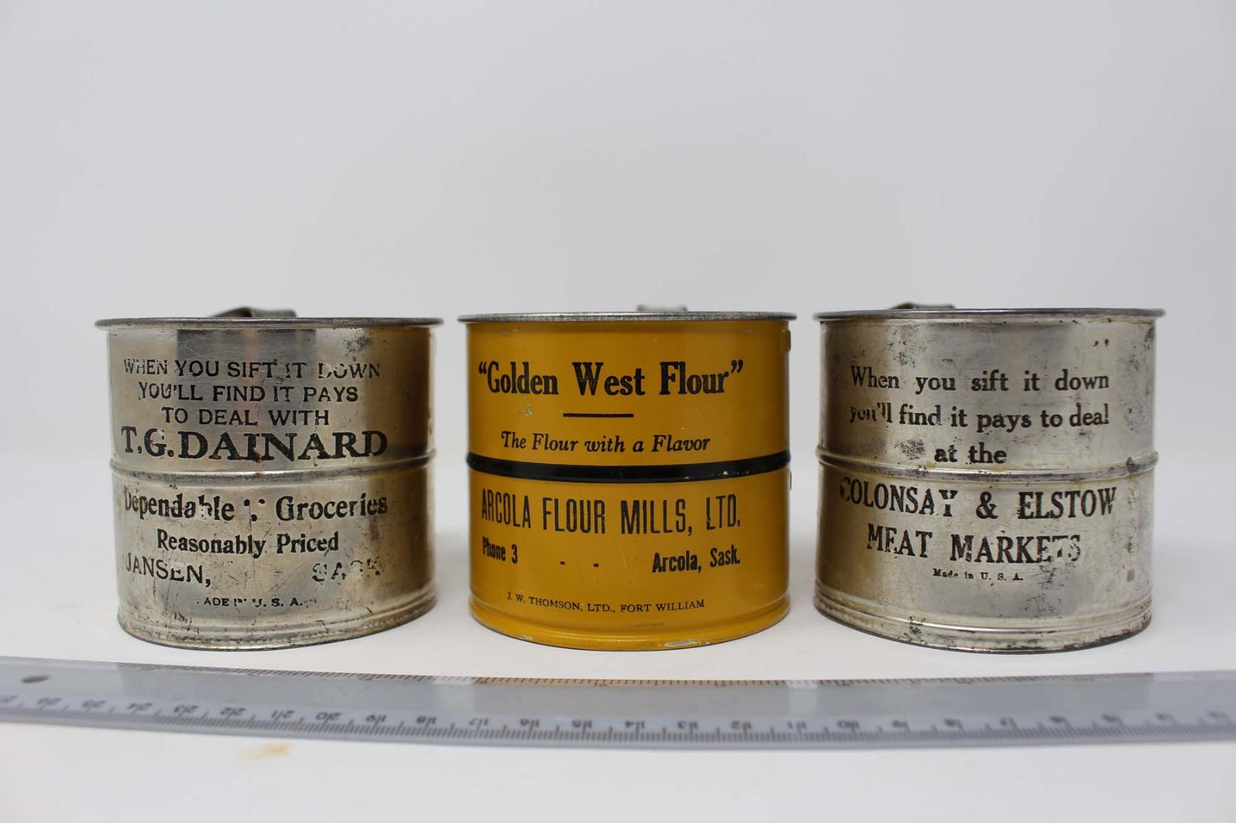 Vintage Advertising Flour Sifters (6)(Saskatoon, Avonlea, Colonsay, Jansen, Arcola and Morse)