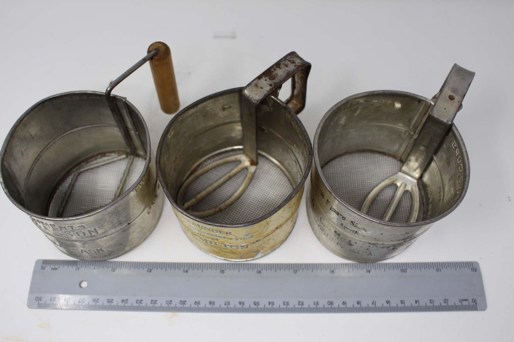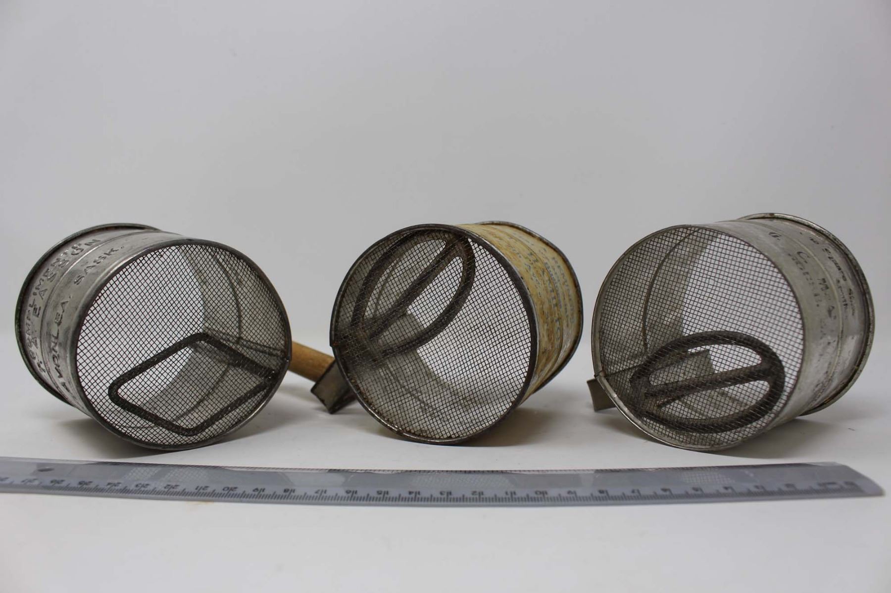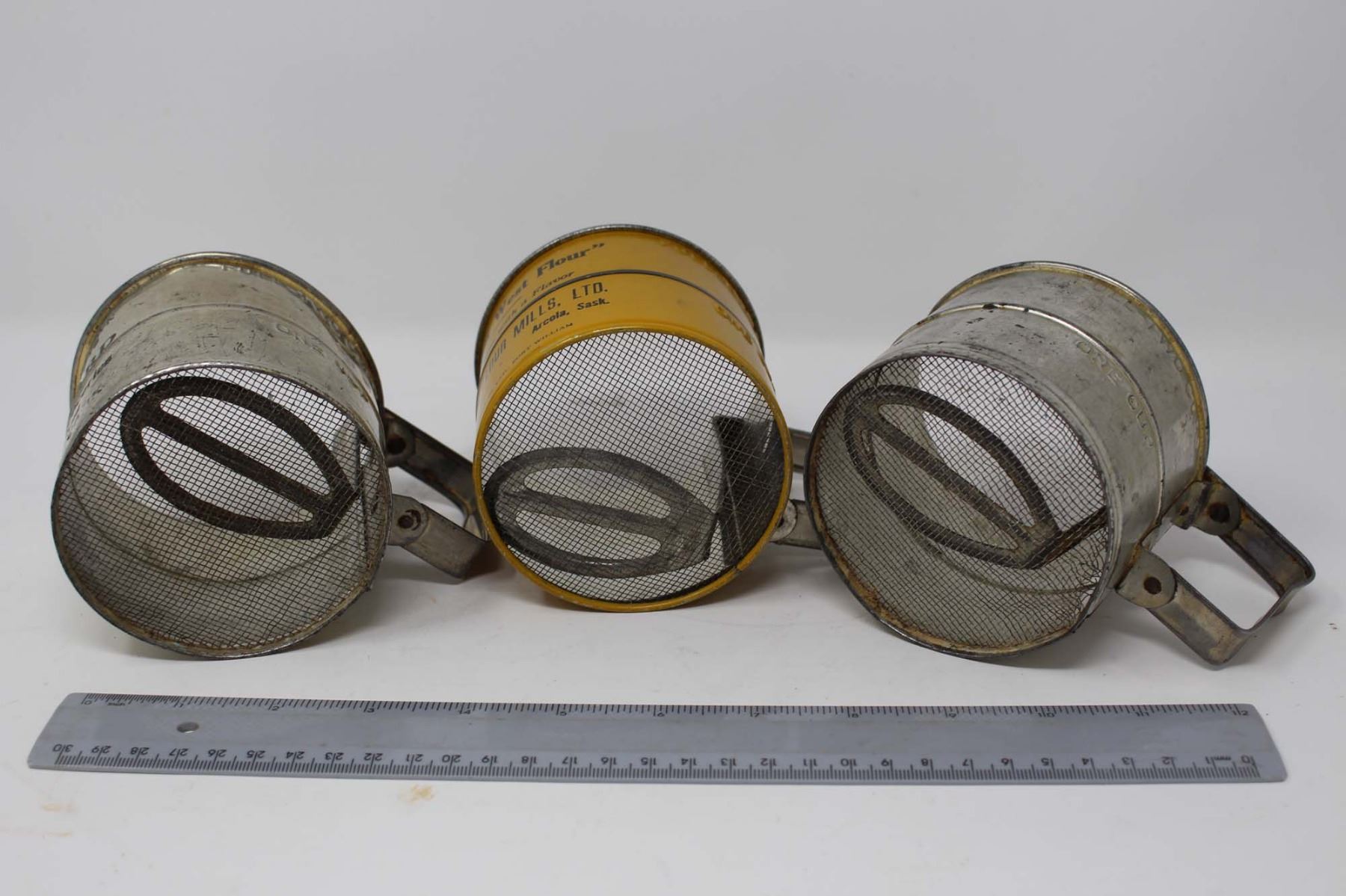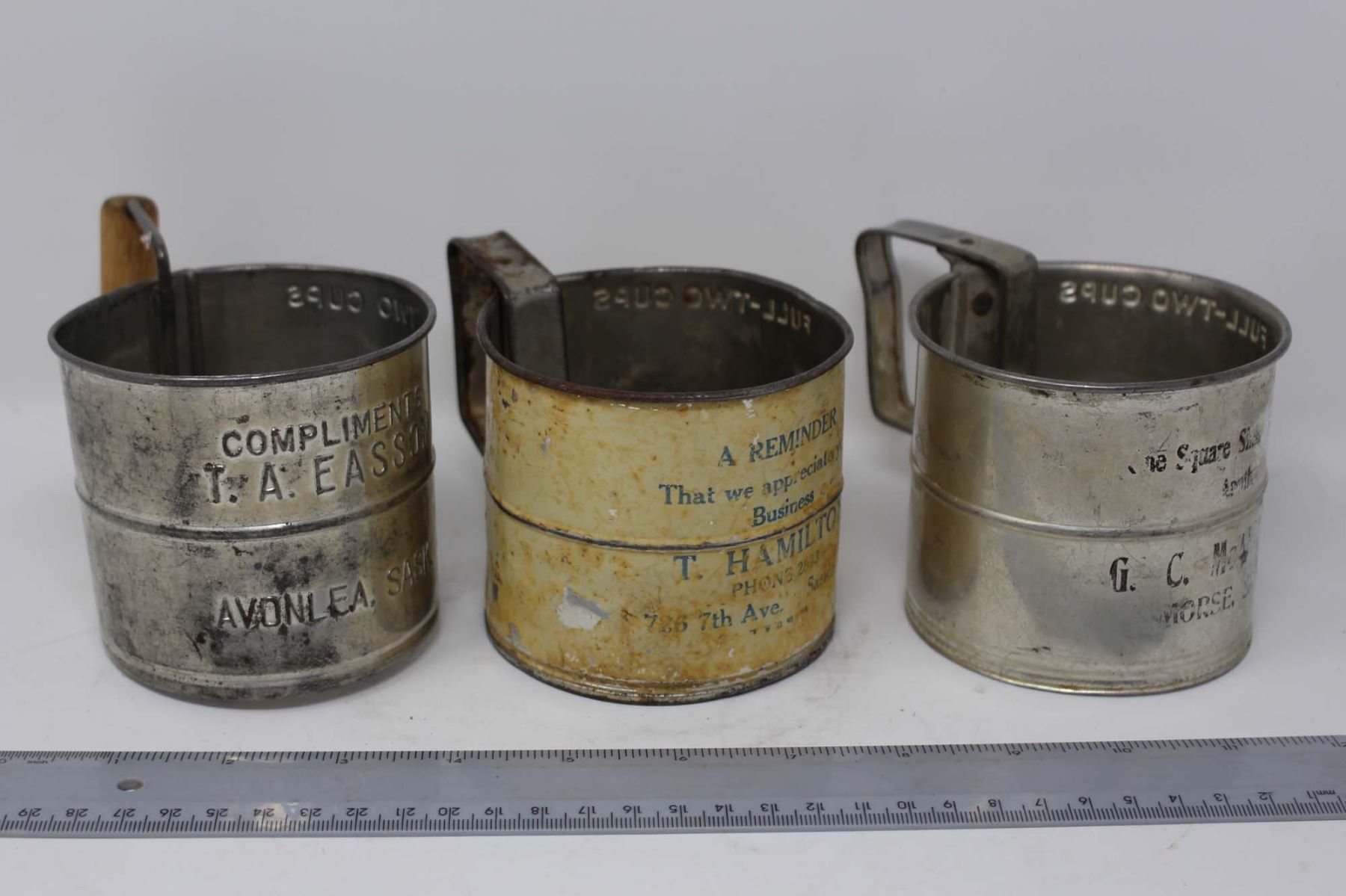 Vintage Advertising Flour Sifters (6)(Saskatoon, Avonlea, Colonsay, Jansen, Arcola and Morse)