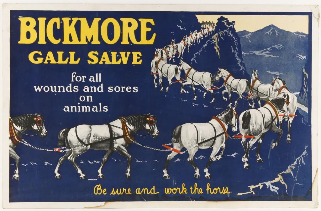Bickmore Gall Salves. Cardboard construction. Blue, and yellow printing depicting a procession of horses. "For all wounds and sores on animals".