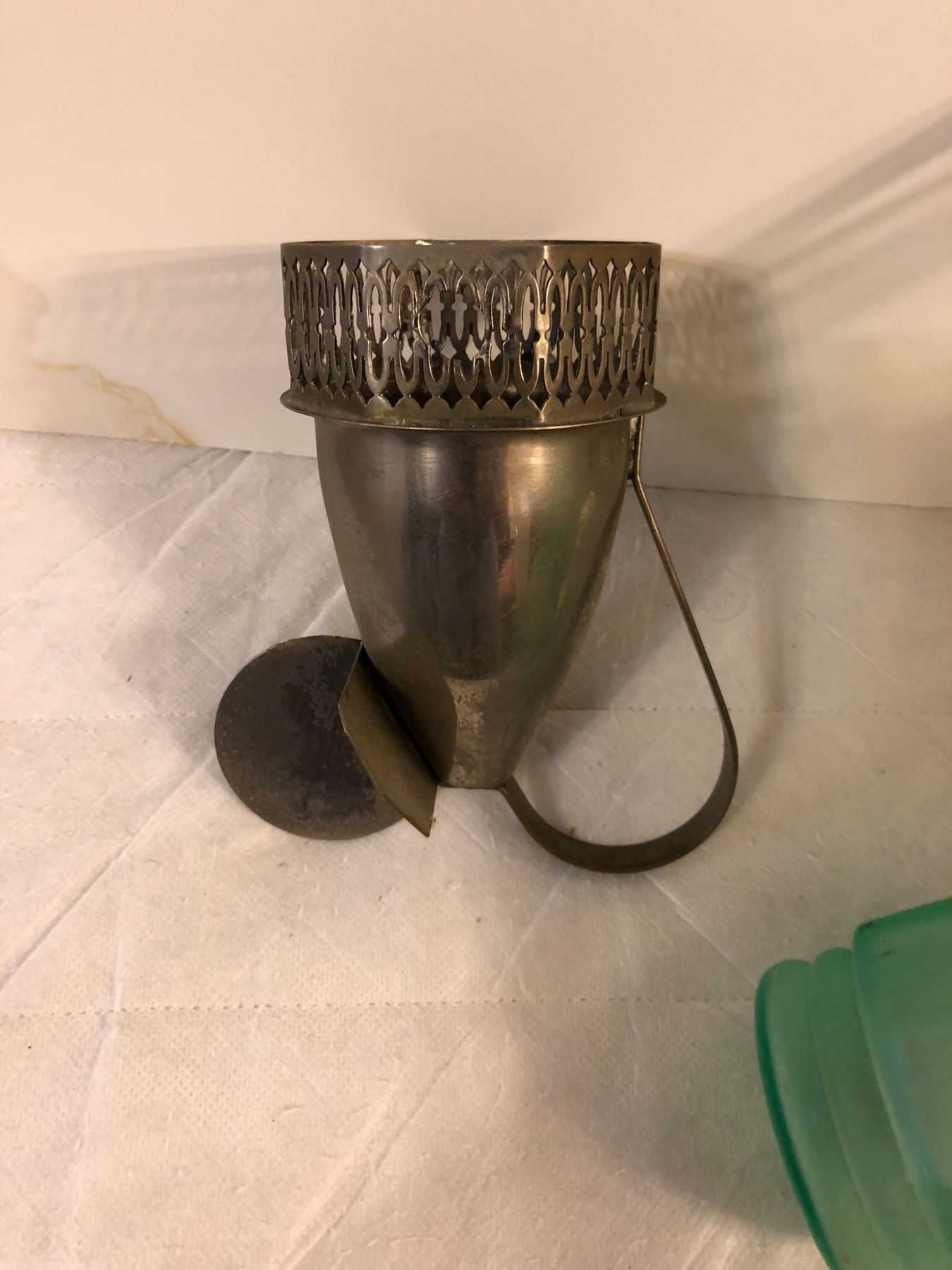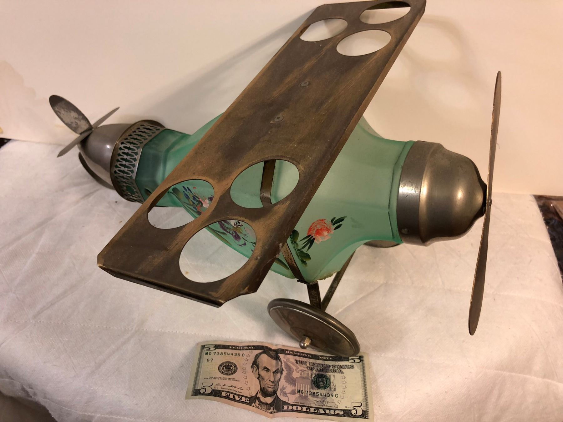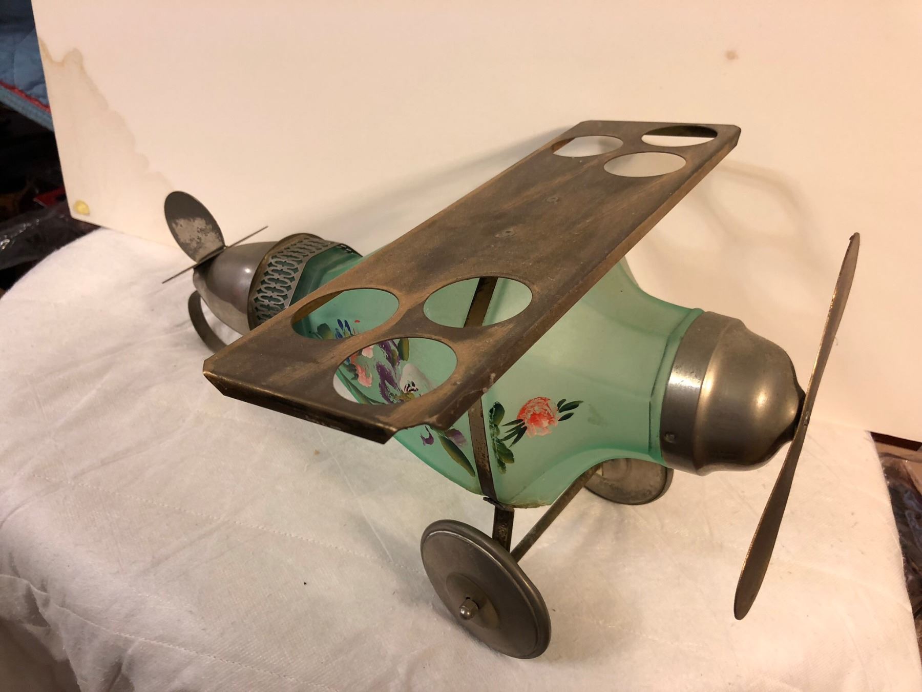 Airplane Decantor/Bar set, made around the time of the Lindburg first continental flight. Decantor, end of the airplane comes off to poor. Wings to hold shot glasses. Very rare item! Has bee repaired.