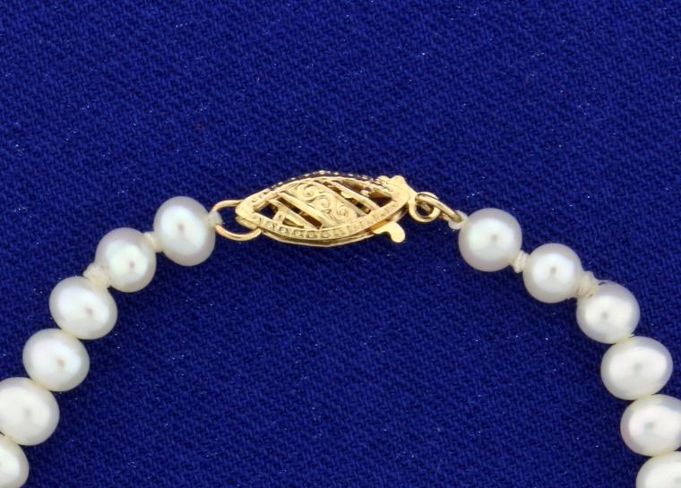 In 14k yellow gold. Contains thirty seven 4.5mm oval shaped high quality natural Akoya Pearls with excellent color and luster. 6 1/4" long.
