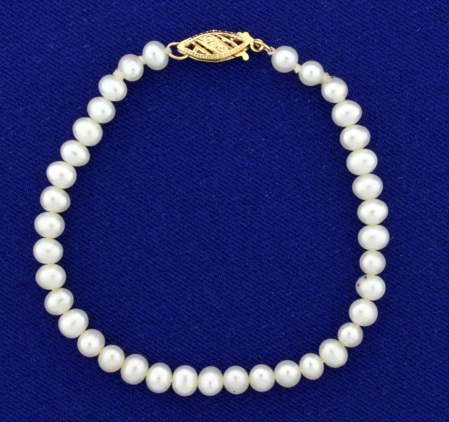 In 14k yellow gold. Contains thirty seven 4.5mm oval shaped high quality natural Akoya Pearls with excellent color and luster. 6 1/4" long.