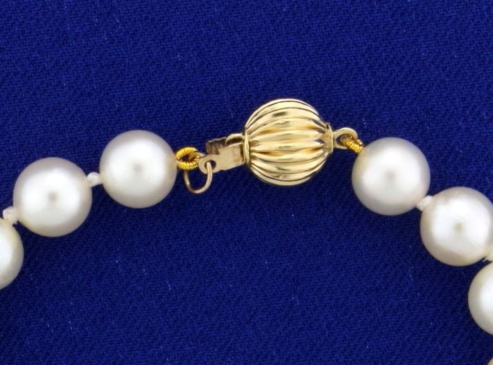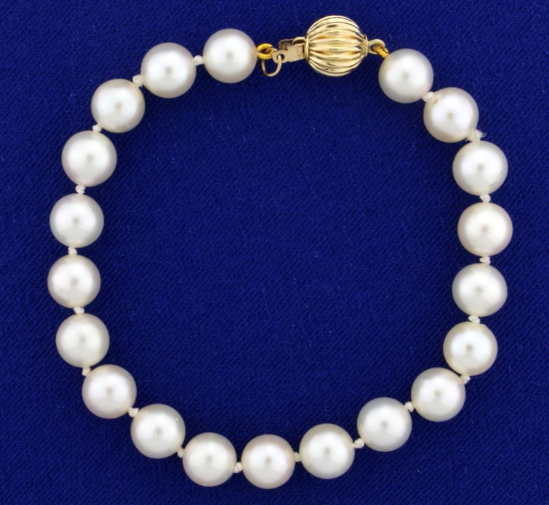 In 14k yellow gold. Contains twenty 7mm high quality pearls with excellent luster and color. 7" long. 10.8g.