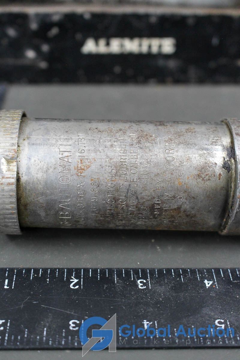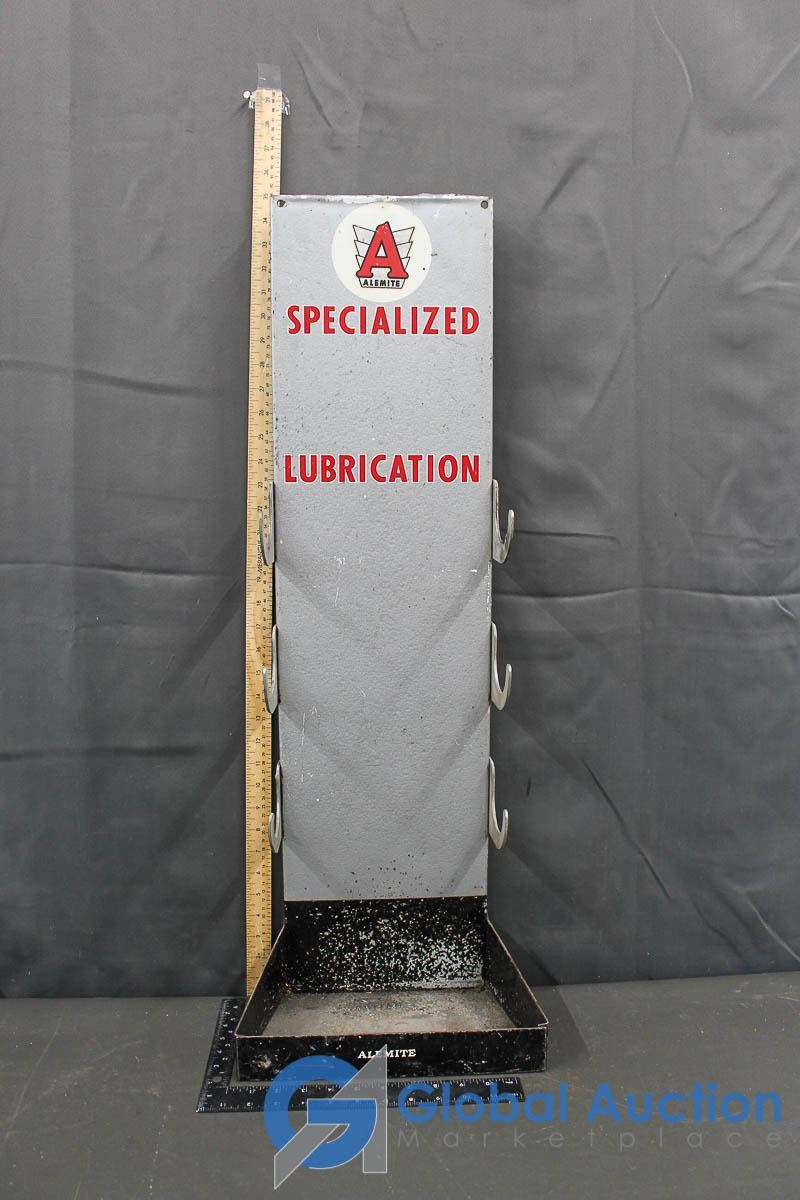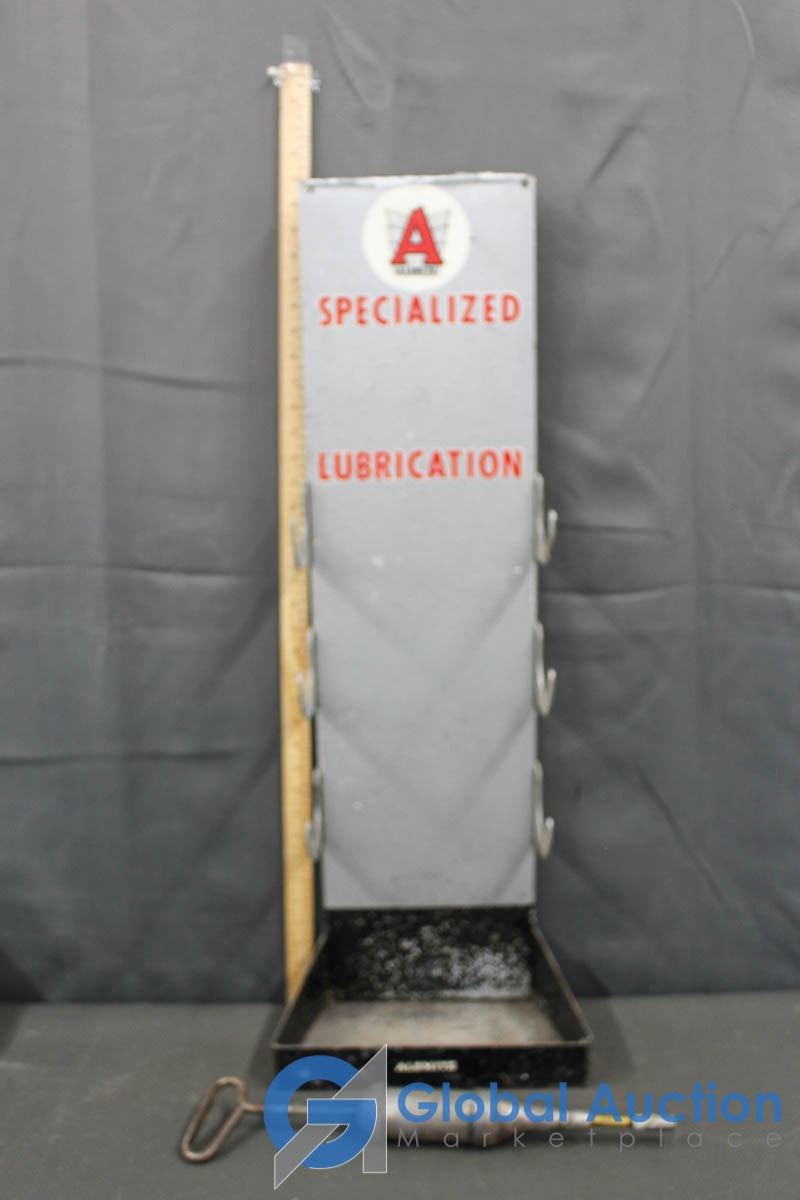 Vintage Alemite Specialized Lubrication Shelf Wrack with Grease Gun