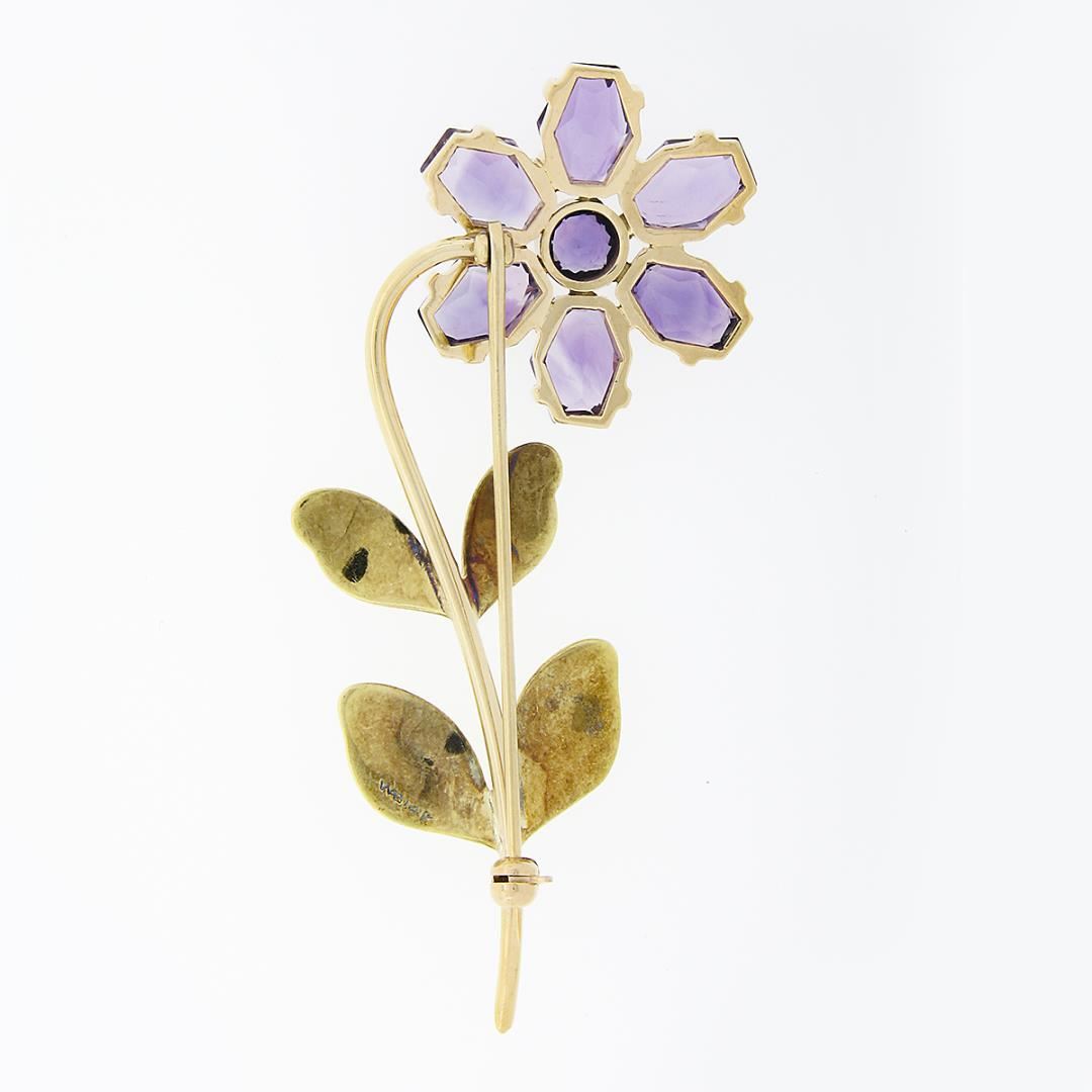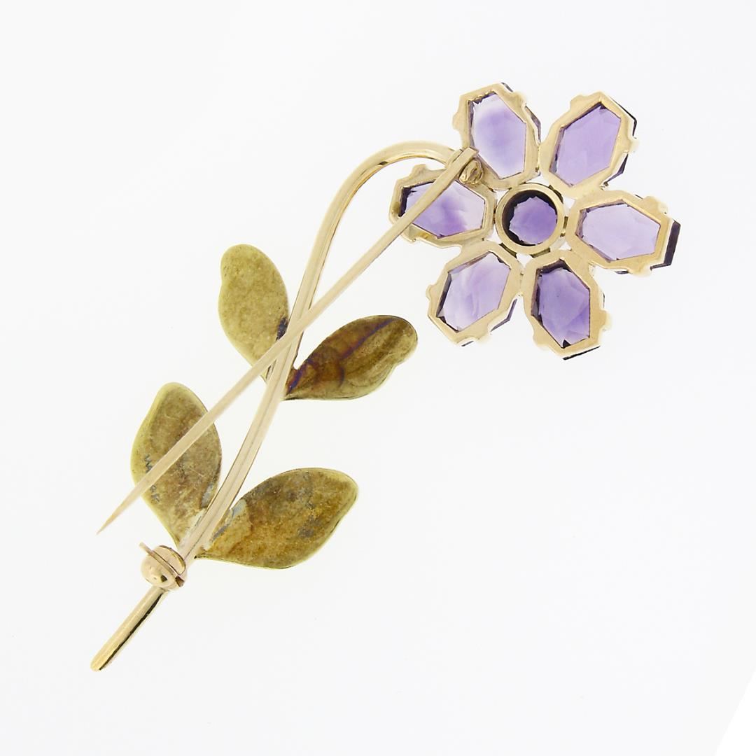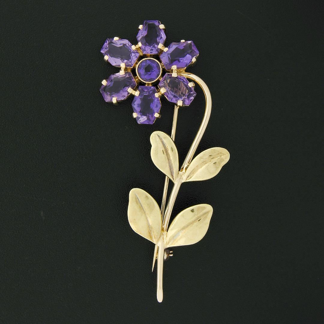 A vintage slid 14k yellow & white gold flower brooch by Allsopp Bliss, featuring 1 round cut natural amethyst (0.55ct), and 6 custom cut natural amethysts (10.00ctw). Measures 68.45x33.7mm and weighs a total of 13.17 grams.