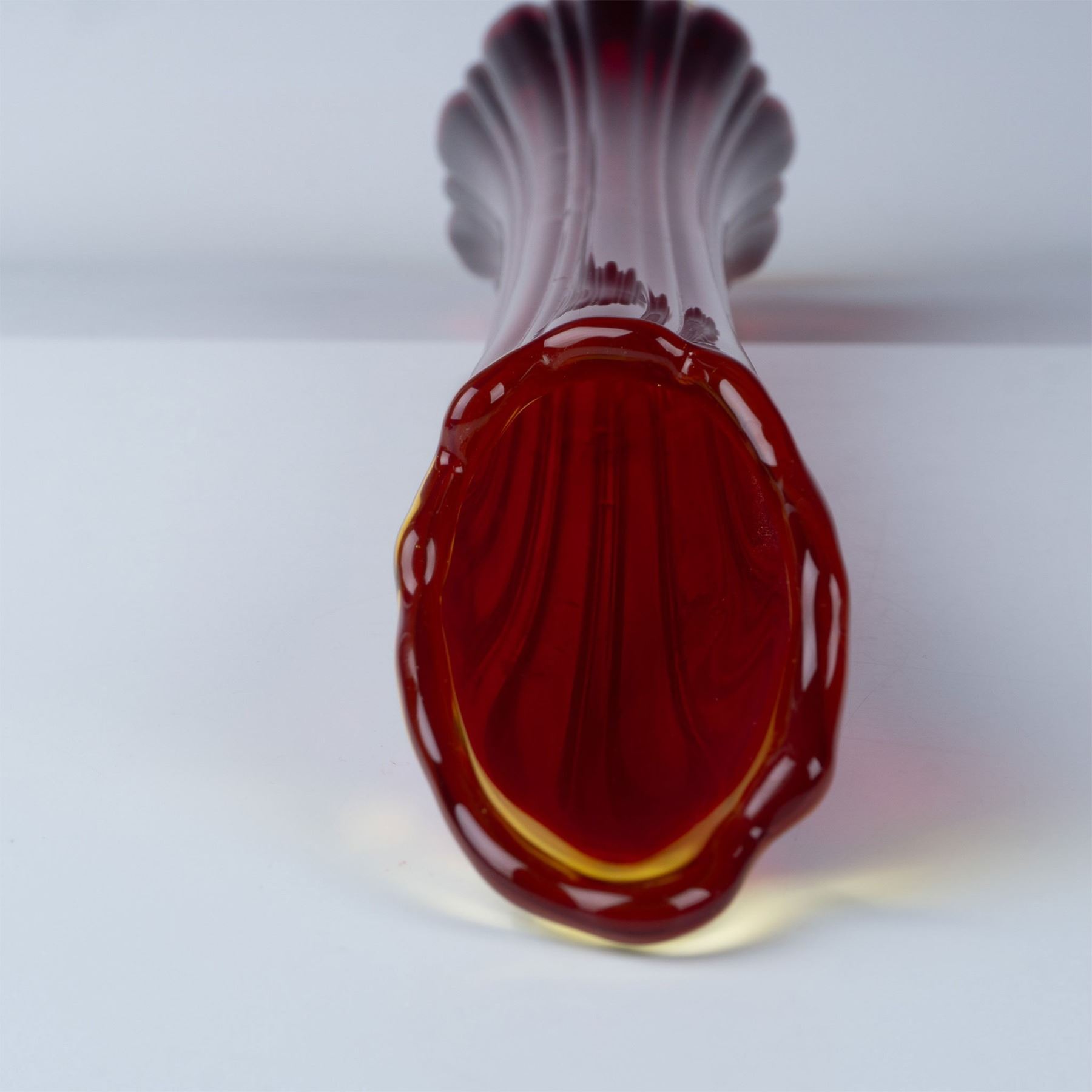 Tall and striking mid-century Amberina glass vase featuring a vibrant color gradient transitioning from deep ruby red to amber at the base. The vase is designed with a fluted body, a scalloped pedestal, and a ruffled rim. Known for its iconic color blending, Amberina glass is a popular collectible among glass enthusiasts.