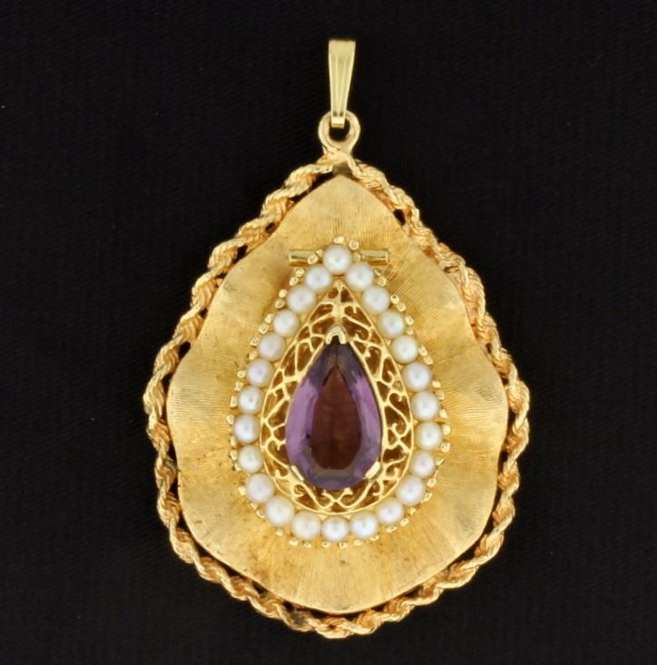 Vintage 14K Locket with Amethyst Pear Shape Center Surrounded by Seed Pearls. The amethyst measures 13mm x 8mm approx. The locket opens from bottom of pearls and hinged! Great old locket. Condition Excellent 2" Long by 1.25" wide. 18.1g