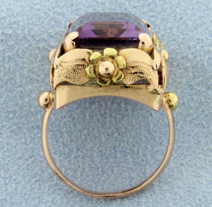 This ring is 18K rose & yellow gold, it contains a 7ct emerald cut amethyst with great color & clarity. Very unique floral design on shank. Size 5 7.0g